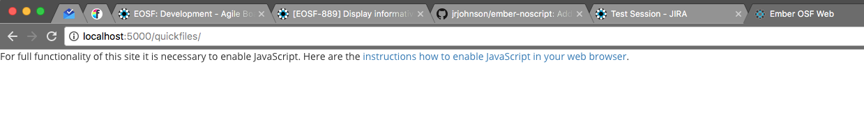 If users do not have JavaScript enabled on their browser, ember-osf pages are displayed as blank white pages. This will add an error message on the page that lets the user know what is happening and how to enable JavaScript to use the site.