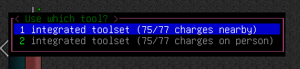 Selecting option 2 (on person) burns down charges as expected and in the future the two options show the updated current charges of the welder, e.g.: 100/400 next time. Selecting option 1 (nearby) consumes no charges from the welder. Also, there is no other welder nearby. |