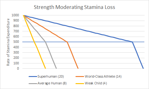 Description was updated, hope it is more understandable now. The question about Strength is based on a lack of the Constitution (or Endurance) stat. It is mostly represented by Strength but not entirely (bodybuilder vs marathon runner). Strength is indirectly included in the slow stamina decreasing, because character with more strength spend less stamina on most actions and spending less stamina means less penalties. |