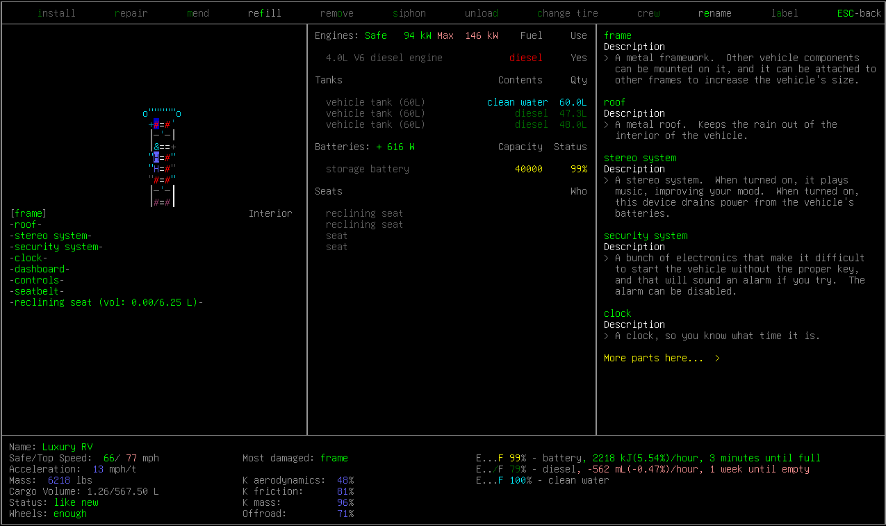 -[ ] Display when dirty water tanks being fed by funnels will be refueled (stretch goal)-[ ] Make some of the columns in the center of the vehicle interaction window prettierIn a luxury RV, with the engine idling and most of the power consuming stuff off.