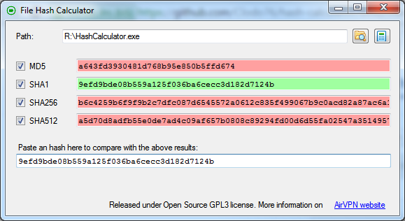 hash-calculator MD5-SHA1-SHA256-SHA512 File Hash Calculator For Microsoft Windows. Run under Linux and OS X with Mono. Maded for AirVPN Community https://airvpn.org/faq/software_signatures/ Released under GPL3