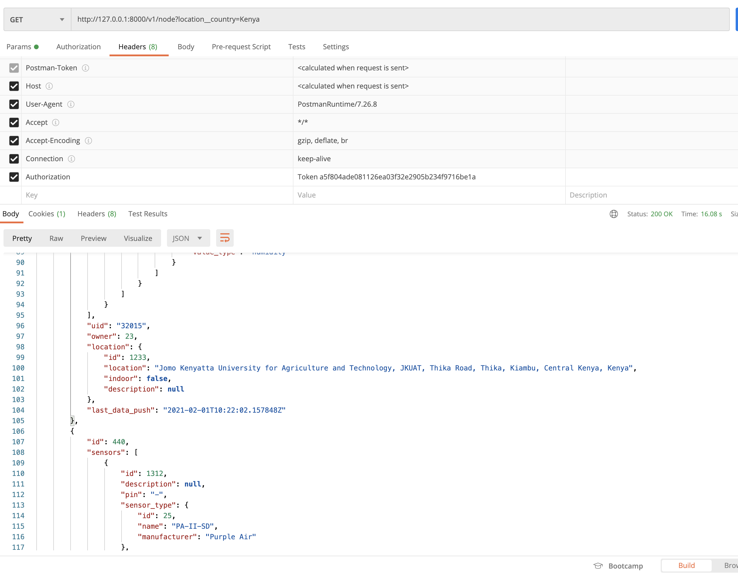 * Ft locations endpoint (#75) * Adds Location Serializer * Allows users to list and create locations * Adds a basename for sensors_location_router * Adds Pagination * Adds Node creation API endpoint (#76) * Adds Node creation API endpoint * Remove un used serializer import * Add Sensors + Sensor_Type Endpoint (#77) * sensors endpoint * fix serializers * authentication on post * sensors type endpoint * Update sensorsafrica/api/v2/views.py Co-authored-by: _ Kilemensi <kilemensi@users.noreply.github.com> * Update sensorsafrica/api/v2/views.py Co-authored-by: _ Kilemensi <kilemensi@users.noreply.github.com> * spelling Co-authored-by: _ Kilemensi <kilemensi@users.noreply.github.com> * [Hotfix] Creation api (#79) * Standardize naming around views, models and routes * Add tests * [Feature] Public / Private Data (#81) * Add SensorDataView using CursorPagination to show all available data * Make /v2/data return all data, keept /data/<sensortype> for air/water, etc. * Switch computation to only work with public data (sensorsAFRICA data for now) * Upgrade backward compatible deps * Add default AUTHENTICATION_CLASSES (#82) Feinstaub framework doesn't set per view authentication classes and hence we need default ones * [Fix] serializer (#83) * Introduce SensorTypeSerializer that will handle uid * Use SensorTypeSerializer * Ensure city and data exists before trying to upload (#85) * Upload data from public sensors only (#87) * [Feature] Make v1/now return public data only (#86) * Recreate feinstaub NowView but with public sensors filter * Switch to custom NowView * Add owner as part of node (#89) * [Fix] v1/node should check groups (#88) * Add NodeView that checks group ownership + pagination * Update router to use new NodeView * Use user id instead of user object (#90) * Adds endpoint for providing metadata (#91) * Adds endpoint for providing metadata * Use dynamic database name * Returns sensors locations and last time database was updated. * Adds sensor networks to returned metadata * Adds authentication to the meta endpoint * Remove a default NETWORKS_OWNER * Use latest created SensorDataValue to know when the database was last updated. * Ensure we only return SensorLocations with a country * Ft increase gurnicorn timeout (#92) * Increase Gunicorn timeout to 3 minutes * Return sorted sensors locations * Includes country in the sensor data serializer (#93) * Includes country in the sensor data serializer * Only return location id and country * Ft add location filter (#95) * Adds a nodes filter using location * Adds nodes filter for v1 of the API * Remove filterling on v2 since it's only used for the F.E map * Use default django filter backend * Makes country location matching case insensitive. * [Ft] Nodes last notify (#94) * update node last_notify * update nodeserializer * import from feinstaub * class naming * code refactor * remove repeating line * comment line * Update sensorsafrica/api/v1/serializers.py Co-authored-by: _ Kilemensi <kilemensi@users.noreply.github.com> * rename verbose to lastnotify * update only when current notify is less than sensordata timestamp Co-authored-by: _ Kilemensi <kilemensi@users.noreply.github.com> * Ft add location filter for /v2/data (#97) * Adds location filter for /data endpoint * Temporaliry Remove iexact * [FT] Time filter (#96) * add last_notify filter on nodes, sensorfilter * view class override * filter ovverides * add exact to look up exp * Includes missing import Co-authored-by: esir <esirkings@gmail.com> Co-authored-by: Khadija Mahanga <khadijamahanga@y7mail.com> Co-authored-by: _ Kilemensi <kilemensi@users.noreply.github.com>