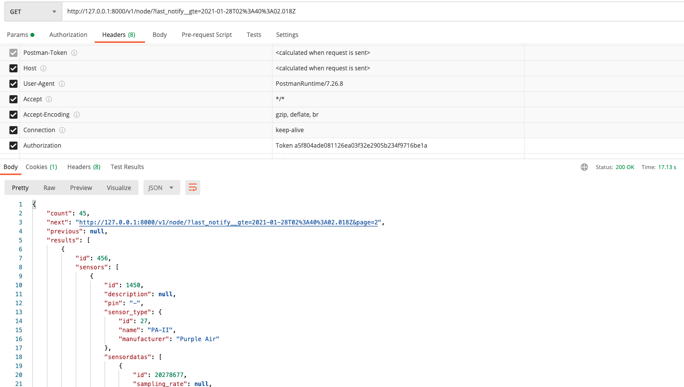 * Ft locations endpoint (#75) * Adds Location Serializer * Allows users to list and create locations * Adds a basename for sensors_location_router * Adds Pagination * Adds Node creation API endpoint (#76) * Adds Node creation API endpoint * Remove un used serializer import * Add Sensors + Sensor_Type Endpoint (#77) * sensors endpoint * fix serializers * authentication on post * sensors type endpoint * Update sensorsafrica/api/v2/views.py Co-authored-by: _ Kilemensi <kilemensi@users.noreply.github.com> * Update sensorsafrica/api/v2/views.py Co-authored-by: _ Kilemensi <kilemensi@users.noreply.github.com> * spelling Co-authored-by: _ Kilemensi <kilemensi@users.noreply.github.com> * [Hotfix] Creation api (#79) * Standardize naming around views, models and routes * Add tests * [Feature] Public / Private Data (#81) * Add SensorDataView using CursorPagination to show all available data * Make /v2/data return all data, keept /data/<sensortype> for air/water, etc. * Switch computation to only work with public data (sensorsAFRICA data for now) * Upgrade backward compatible deps * Add default AUTHENTICATION_CLASSES (#82) Feinstaub framework doesn't set per view authentication classes and hence we need default ones * [Fix] serializer (#83) * Introduce SensorTypeSerializer that will handle uid * Use SensorTypeSerializer * Ensure city and data exists before trying to upload (#85) * Upload data from public sensors only (#87) * [Feature] Make v1/now return public data only (#86) * Recreate feinstaub NowView but with public sensors filter * Switch to custom NowView * Add owner as part of node (#89) * [Fix] v1/node should check groups (#88) * Add NodeView that checks group ownership + pagination * Update router to use new NodeView * Use user id instead of user object (#90) * Adds endpoint for providing metadata (#91) * Adds endpoint for providing metadata * Use dynamic database name * Returns sensors locations and last time database was updated. * Adds sensor networks to returned metadata * Adds authentication to the meta endpoint * Remove a default NETWORKS_OWNER * Use latest created SensorDataValue to know when the database was last updated. * Ensure we only return SensorLocations with a country * Ft increase gurnicorn timeout (#92) * Increase Gunicorn timeout to 3 minutes * Return sorted sensors locations * Includes country in the sensor data serializer (#93) * Includes country in the sensor data serializer * Only return location id and country * Ft add location filter (#95) * Adds a nodes filter using location * Adds nodes filter for v1 of the API * Remove filterling on v2 since it's only used for the F.E map * Use default django filter backend * Makes country location matching case insensitive. * [Ft] Nodes last notify (#94) * update node last_notify * update nodeserializer * import from feinstaub * class naming * code refactor * remove repeating line * comment line * Update sensorsafrica/api/v1/serializers.py Co-authored-by: _ Kilemensi <kilemensi@users.noreply.github.com> * rename verbose to lastnotify * update only when current notify is less than sensordata timestamp Co-authored-by: _ Kilemensi <kilemensi@users.noreply.github.com> * Ft add location filter for /v2/data (#97) * Adds location filter for /data endpoint * Temporaliry Remove iexact * [FT] Time filter (#96) * add last_notify filter on nodes, sensorfilter * view class override * filter ovverides * add exact to look up exp * Includes missing import Co-authored-by: esir <esirkings@gmail.com> Co-authored-by: Khadija Mahanga <khadijamahanga@y7mail.com> Co-authored-by: _ Kilemensi <kilemensi@users.noreply.github.com>