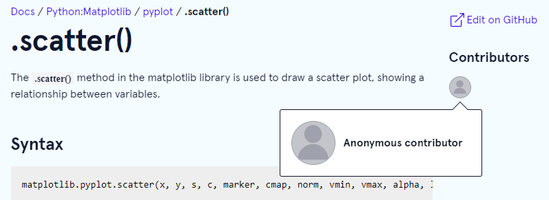 @alekseymor Congrats on your new contribution. The live link is here:https://www.codecademy.com/resources/docs/matplotlib/pyplot/scatter You're currently listed as an anonymous contributor. If you want to be credited follow the instructions below to add your GitHub username to your Codecademy profile. If not, there is nothing more you need to do. To add your GitHub username to your Codecademy profile: 1.) Add your GitHub Username to your Codecademy Profile Details, you can get there on your desktop by pressing on your profile picture in the upper right-hand corner and selecting "Profile" in the drop-down box: 2.) Then log out and log back into Codecademy using your GitHub login: |