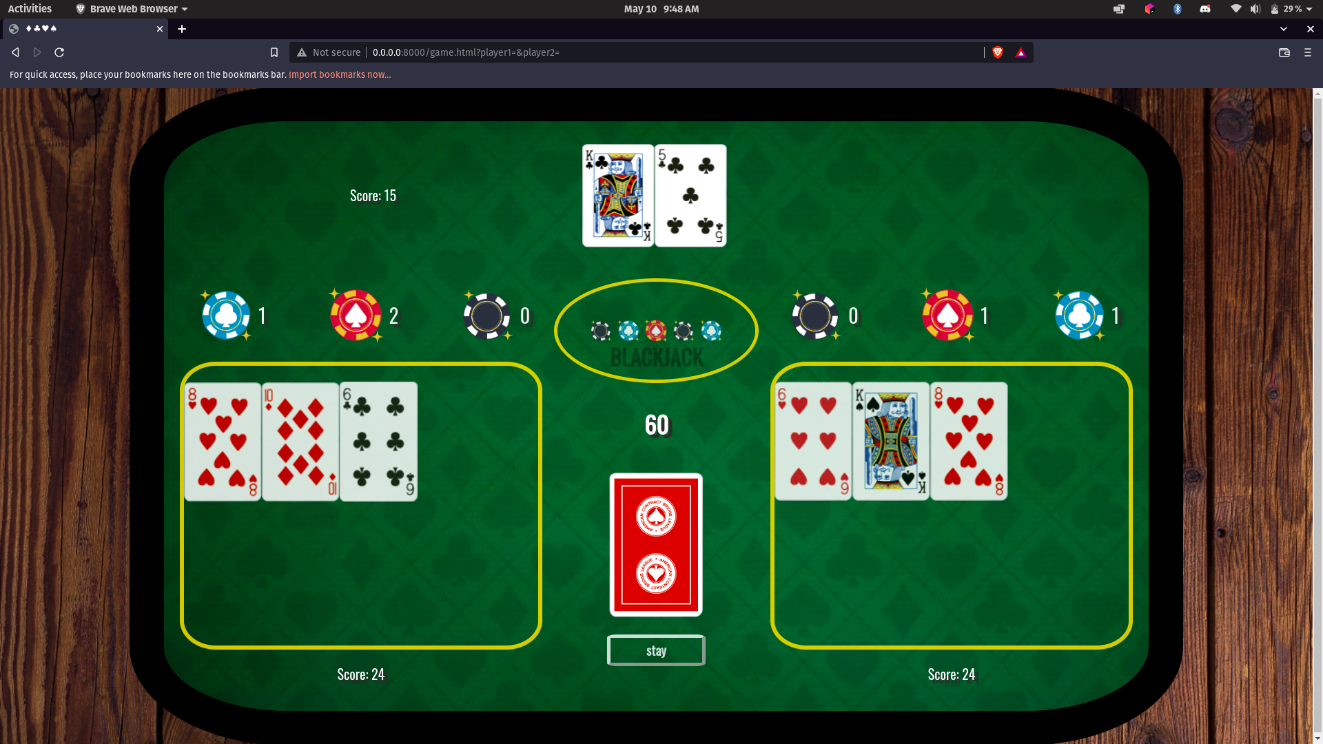 Our task was to make a game that runs in the browser. We had some good ideas, but ultimately decided on Black jack.