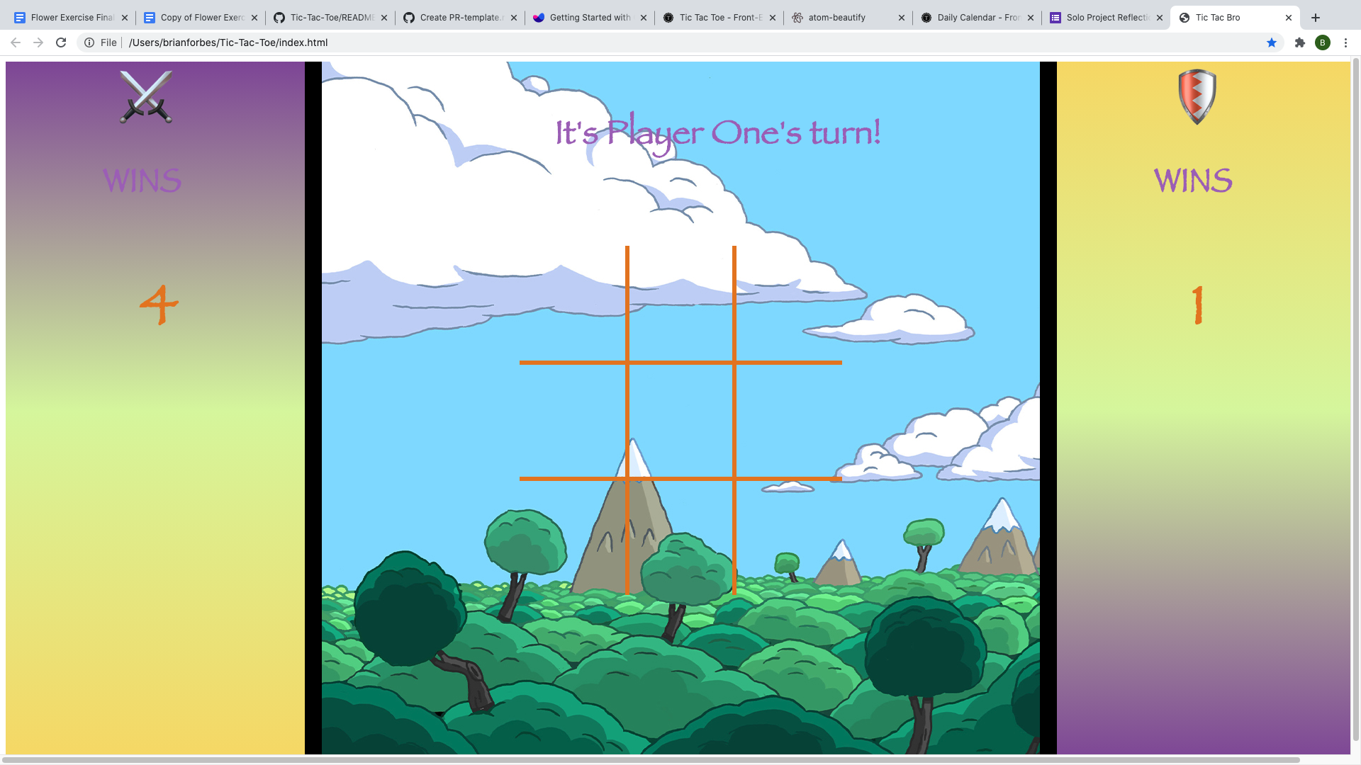 What do you know, it's Tic-Tac-Toe! Swords vs Shield! You know how to play this classic game! Just click on a square and your token will be placed in the appropriate square. This is a two player version, no AI computer to play against. The current player's turn will be displayed at the top of the screen. When a win occurs, the winning player will be declared at the top of the screen. If there is a draw, you will be notified as well. Whether win or draw, simply wait a few seconds and the game will restart. Each players score will persist across each new game and page reload/refresh as well via local storage.