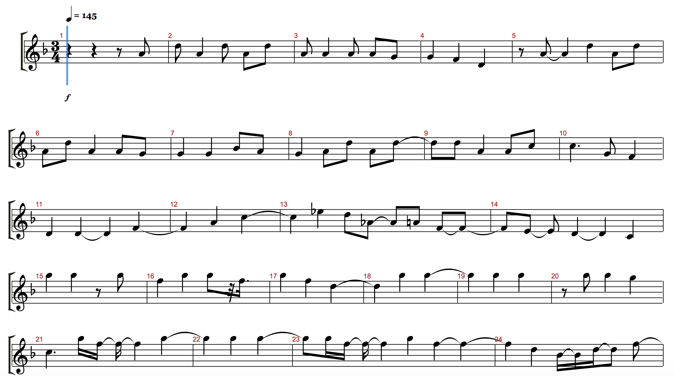\tuning none\tempo 145.\ks F \ts 3 4 \clef G2 r.4 r.4 r.8 a4.8 | d5.8 a4.4 d5.8 a4.8 d5.8 | a4.8 a4.4 a4.8 a4.8 g4.8 | g4.4 f4.4 d4.4 | r.8 a4.8 -.4 d5.4 a4.8 d5.8 | a4.8 d5.8 a4.4 a4.8 g4.8 | g4.4 g4.4 a#4.8 a4.8 | g4.4 a4.8 d5.8 a4.8 d5.8 | -.8 d5.8 a4.4 a4.8 c5.8 | c5.4{d} g4.8 f4.4 | d4.4 d4.4 -.4 f4.4 | -.4 a4.4 c5.4 | -.4 d#5.4 d5.8 g#4.8 -.8 a4.8 f4.8 -.8 | -.8 e4.8 -.8 d4.4 -.4 c4.4 | a5.4 a5.4 r.8 a5.8 | f5.4 a5.4 a5.8 r.32 f5.16{d} | a5.4 f5.4 d5.4 | -.4 a5.4 a5.4 | -.4 a5.4 a5.4 | r.8 a5.8 a5.4 g5.4 | c5.4{d} a5.16 f5.16 -.16 -.4 a5.4 | -.4 a5.4 a5.4 | -.8 a5.16 f5.16 -.16 -.4 a5.4 f5.4 -.4 | -.4 d5.4 a#4.16 -.16 d5.16 -.8 f5.8 | -.8 d5.8 f5.8 a5.8 d5.4 -.4 | -.4 f4.16 a#4.8{d} a4.8 f4.8 | -.4 r.4 f4.4 | g#4.8 f4.8 -.8 g4.4 r.16 g#4.8{d} | r.8 g#4.8 f4.4 g#4.4 | g4.4 f4.16 g#4.8{d} f4.4 | f4.4 g#4.4 g4.4 | g#4.8 g4.8 f4.16 g#4.8{d} f4.8 g#4.8 | g4.8 f4.16 g#4.16 r.8 g4.8 g#4.8 g4.8 | f4.8 d4.8 f4.4 g#4.8 g4.8 | -.4 g#4.16 f4.16 -.8 g4.8 f4.4 | f4.4 g#4.4 g4.8{d} f4.16 | r.8 f4.16 g4.16 f4.4 f4.4 | g#4.4 g4.4 f4.8 f4.8 | g4.16 f4.8{d} d4.8 f4.8 g#4.8 g#4.8 | g#4.4 f4.2 | c5.4 -.4 e5.4 -.4 g5.4 | g5.8 g5.8 e5.8 c5.8 f5.8 f5.8 | f5.8 f5.16 -.16 g5.16 -.4 a5.4 -.4 | -.4 e5.8 e5.8 -.4 g5.4 | c5.4 e5.8 c5.8 e5.8 g5.8 | f5.4 f5.8 f5.16 -.16 g5.16 -.4 a5.4 | -.2 a#5.8 a#5.8 | -.4 d6.4 a#5.8 c#6.8 c#6.8 c#6.8 | -.8 a#5.8 f5.4 f5.8 f5.8 | g#5.4 d6.2 | a#4.8 -.8 d5.8 g5.8 g5.8 e5.4 -.4 | e5.4 e5.4{d} f5.8 | f5.4 f5.8 e5.8 -.8 d5.4 -.4 | -.4 c5.4 -.4 a#5.4 | a5.4 -.4 -.4 g5.4 | f5.4 -.4 -.4 f5.4 | e5.4 -.4 -.8 d5.4{d} | c5.2 a#5.4 | a5.4{d} g5.4{d} | f#5.2 d5.4 | a#4.2 d5.4 | b4.4 d5.4 c5.4 -.4 | -.4 c#5.4 d5.4 | d5.4 r.8 f5.8 f5.8 d5.16 a#4.16 | r.16 a#4.8{d} e5.16 g5.16 -.32 e5.16{d} r.16 a4.8{d} | a4.16 g4.16 f4.8 d5.4 g4.8 e5.8 | -.8 a4.8 f5.4 r.4 | r.8 f#4.16 g#4.16 f#4.16 g#4.8 f#4.16 g#4.16 f#4.16 -.8 g#4.8 | c#5.8 g#4.8 c#5.8 g#4.8 c#5.8{d} a#4.16 | b4.4 a#4.8 g#4.16 f#4.16 g#4.16 f#4.16 -.8 g#4.8 | f#4.16 g#4.16 f#4.8 -.8 g#4.8 c#5.8 r.16 c#5.8{d} | r.8 a#4.8 a#4.4 a4.16 a#4.8{d} | a#4.16 a4.16 -.8 a#4.8 r.16 c5.8{d} g4.8{d} f#4.16 | g#4.8 f#4.16 g#4.16 f#4.16 g#4.8 f#4.16 g4.16{d} c#5.32 -.8 | c#5.4 g#4.8 a#4.16 a4.16 -.16 -.4 a#4.4 | a#4.4 b4.16 c5.8 g4.16 e4.16 c4.8{d} | c#4.8 c#4.8 a#3.4 e4.8 c#4.8 | r.16 f4.16 e4.8 -.8 r.16 f#4.16 g4.8 c4.8{d} g4.16 | g#4.16 g4.16 -.8 g#4.8 r.16 a#4.16 a4.16 -.16 -.16 a#4.16 -.4 c5.4 | -.4 c5.4 c5.4 | -.4 c5.4 c5.4 | e5.4{d} f5.8 r.16 g#4.8{d} | e4.8 d#4.8 d4.4 c5.4 | g4.4 c5.8 b4.8 c5.4 | c5.4 -.4 c#5.4 e4.8 c#5.8 | -.8 c#4.8 e4.8 c#4.8 c#4.16 e4.16 d#4.8 -.8 | -.16 c5.16 c5.8 c#5.8 e4.8 c#5.4 | c#4.16 e4.16 c#4.8 -.8 e4.16 c#4.16 -.8 e4.8 d#4.8 c5.8 | c#5.8 e4.8 c#4.8{d} c#4.16 e4.8 e4.8 | c#4.16 e4.16 d#4.8 c5.4 a3.8 f#4.8 | a#3.16 c4.8 e4.16 g4.16 c5.16 c#4.8 -.8 c#4.4 | -.4 r.4 a3.4 | a#3.2 -.8 {d} a3.16 | -.8 d3.8 a#3.2 | -.4 a3.8 -.8 a#3.8 -.16 a3.8 f3.16 | d3.4 a#3.2 | a3.4 -.4 -.4 f3.8 d3.8 | a3.2{d} | -.2 -.8 a4.8 | d5.8 a4.8 d5.8 a4.8 d5.8 a4.8 | r.16 a4.16 a4.8 a4.8 g4.8 g4.8 f4.8 -.8 | -.8 d4.8 -.8 -.4 a4.8 d5.8 | a4.8 d5.8 a4.8 d5.8 a4.8 g#4.16 -.16 a4.16 | g4.4 -.4 g4.4 g4.8{d} c5.16 | a#4.8 a4.8 g4.4 a4.8 d5.8 | a4.8 d5.4 d5.8 a4.16 g#4.16 -.16 -.8 a4.8 | -.4 c5.4 c5.4 g4.8 f4.8 | -.8 d4.4{d} d4.4 | f4.4 a4.4 c5.4 | d#5.8 d5.8 g#4.8 a4.8 f4.4 | -.4 r.4 r.4