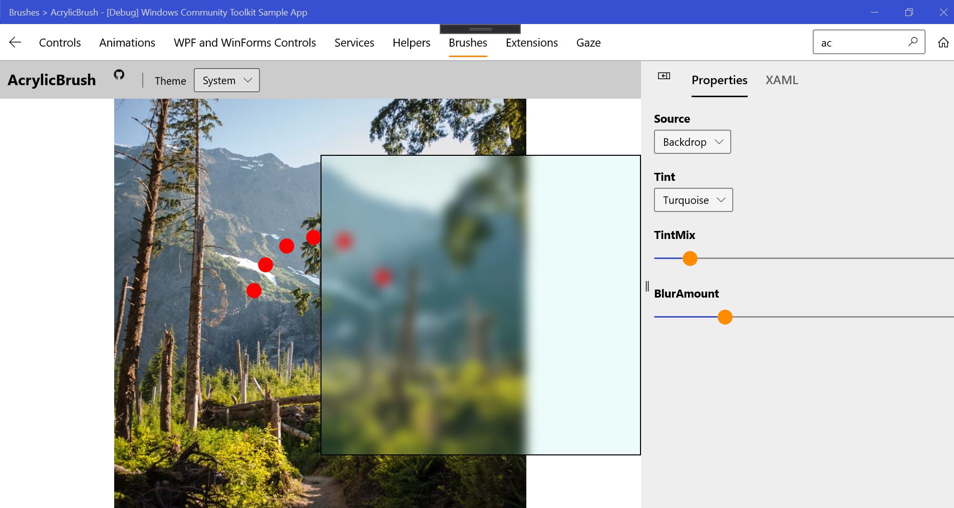 AcrylicBrushand the variousPipelineBuilderAPIs to create acrylic brushes are using the incorrect placement for the blend effect adding the noise texture at the end of the pipeline. THis bug was introduced in #3298, as I forgot to update the code there after swapping the way the placement property worked 🤦♂️What is the new behavior?