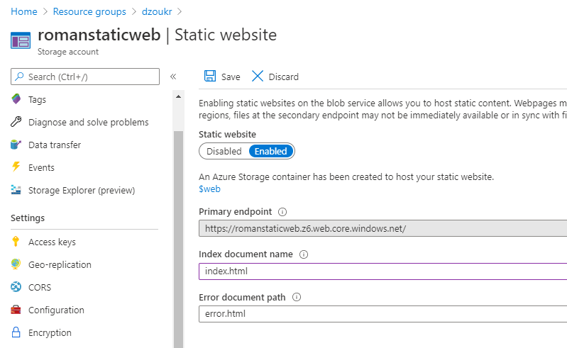 Adding support for static website for Storage Account (Post-deploy task) 1197b9f