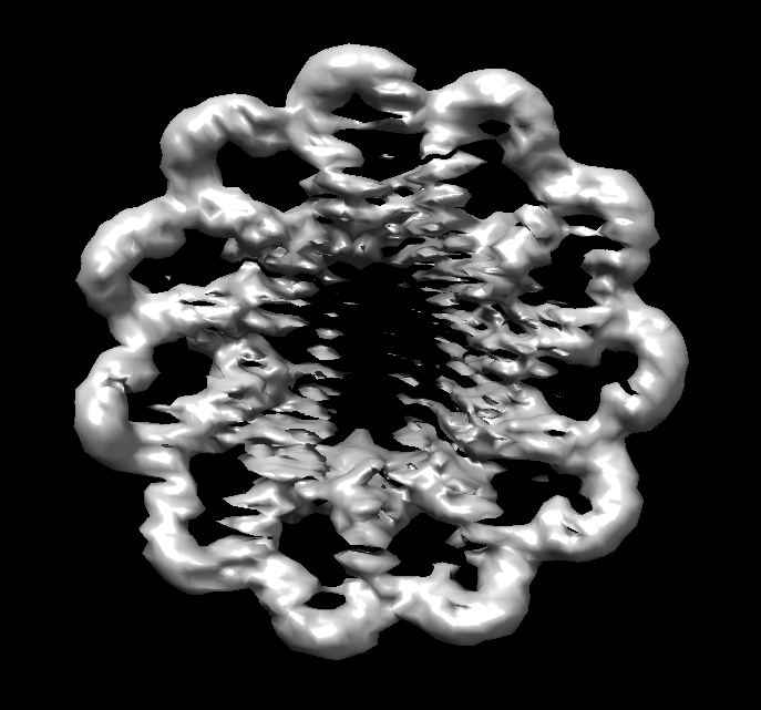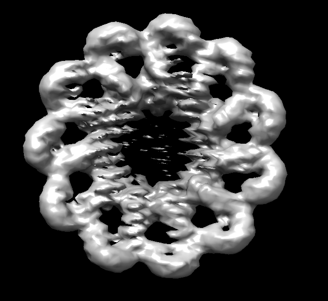Follow up on reconstruction pipelines. I ran an A/B test on the initial code and after first refactor. Appears to be performing well. I will run one more reconstruction with the code in its current state and follow up. The initial reconstruction (prior to Garrett's review) was using 500 images with a low level of noise generated from the volume map of this C11 molecule. A subsequent reconstruction was performed after significant refactor. The refactor included; restriction of "equator" candidate rotations during generation, using synchronized-mean to estimate In order to replicate the conditions of the initial reconstruction I supplied the same candidate rotations to the refactored algorithm (414 out of 500 of the initial candidates were non-equator candidates). Here is that reconstruction: |