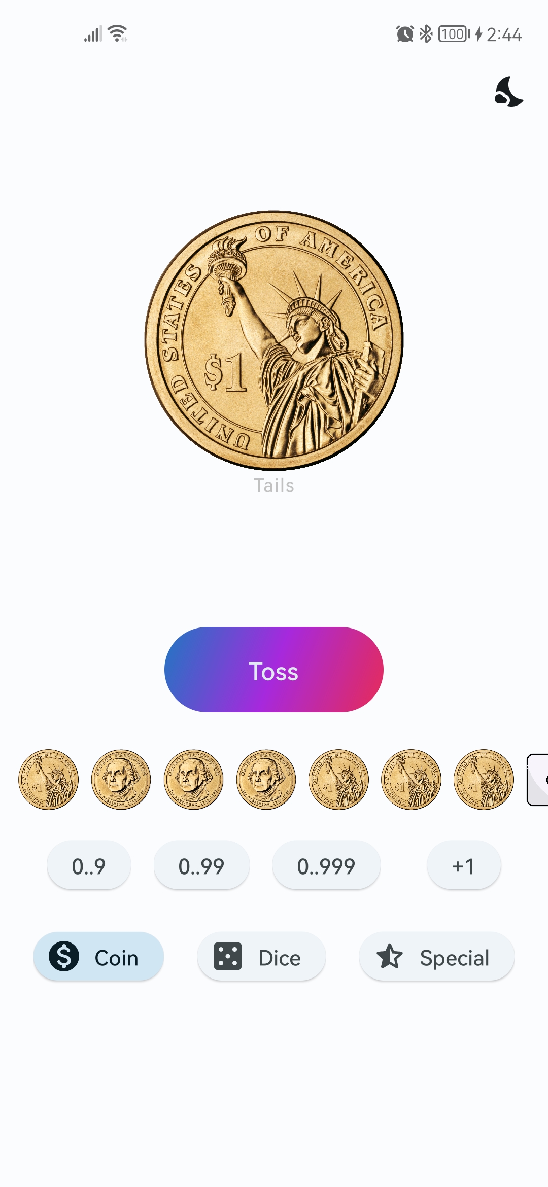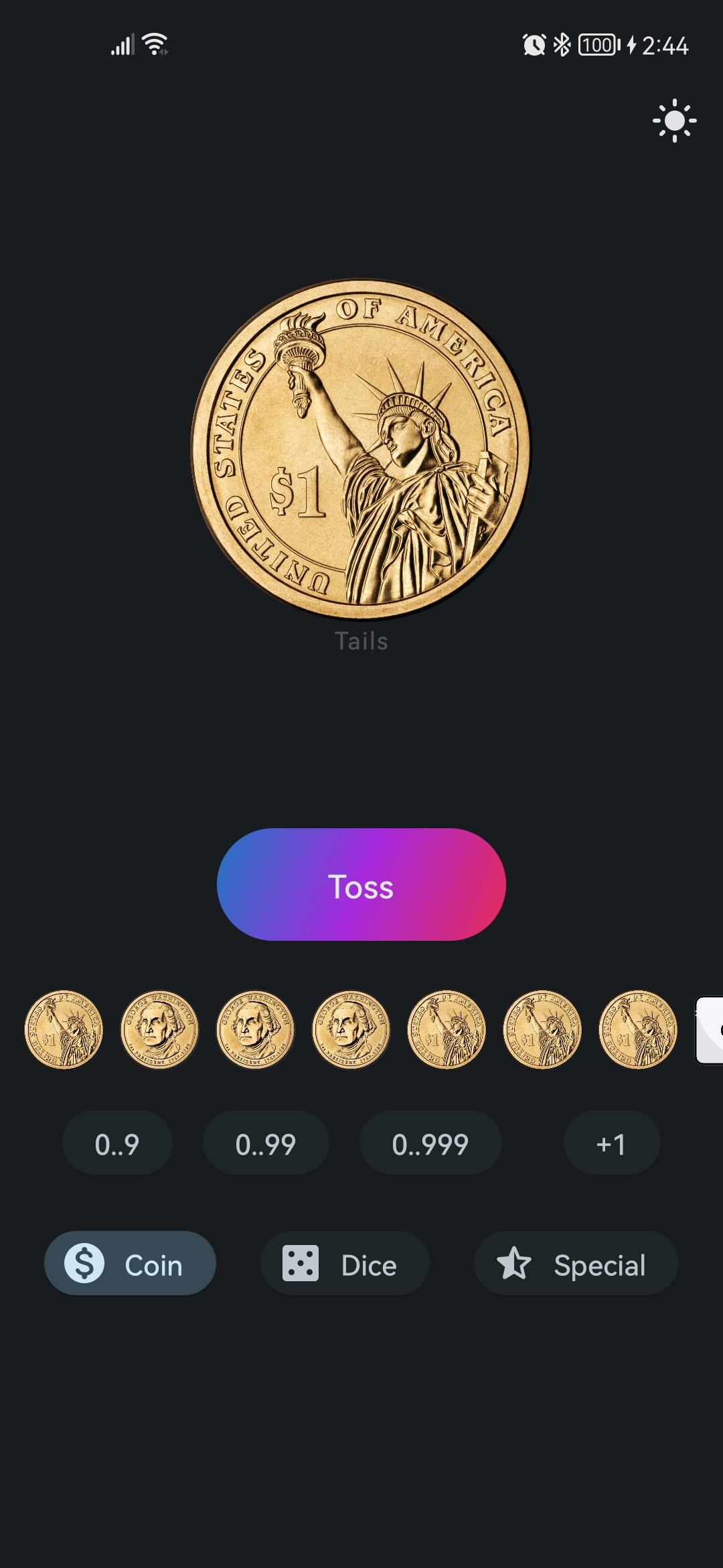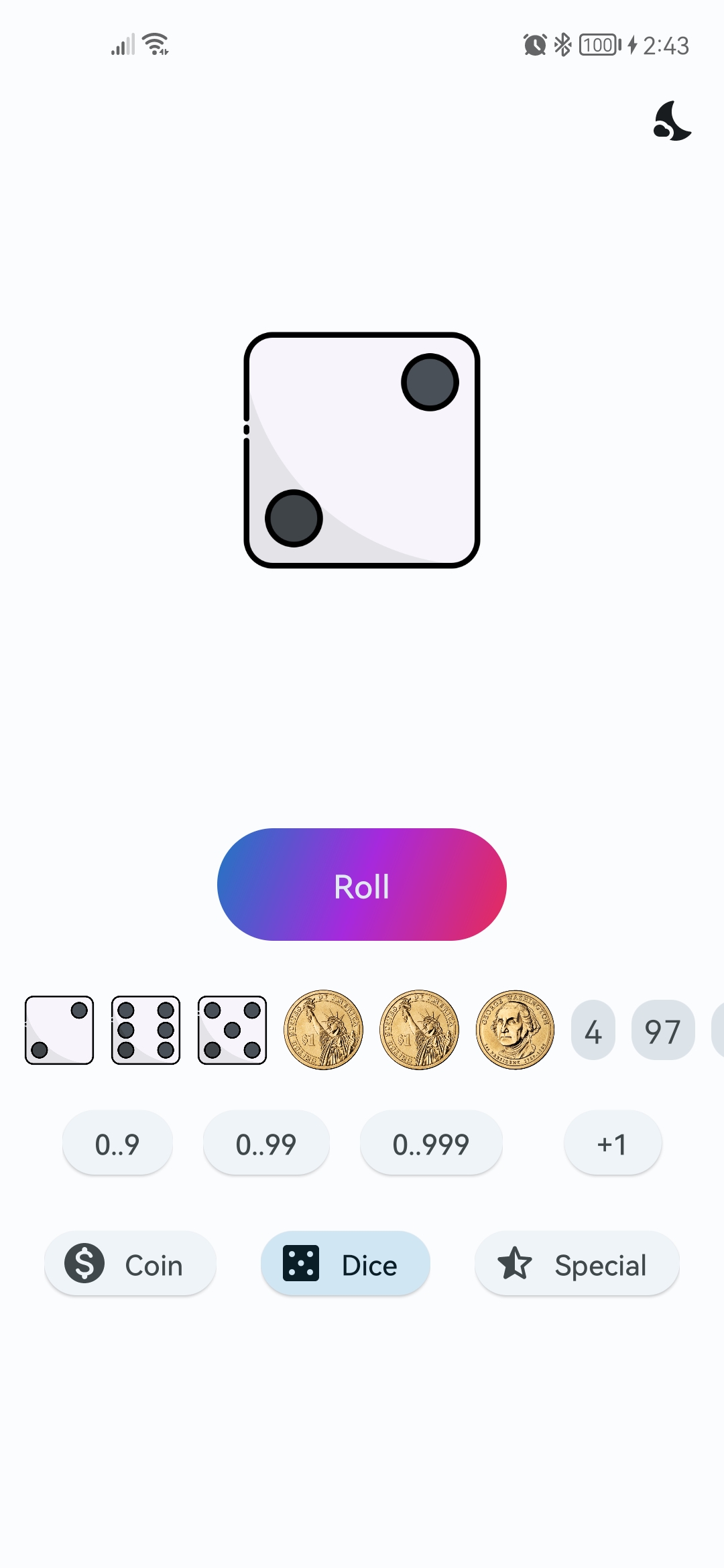 Randomizer Tech stack Kotlin, MVVM, Jetpack compose, Hilt, Accompanist, Material 3 Features generate a random number toss a coin roll a dice Download Play Market Screenshots Dark theme Light theme