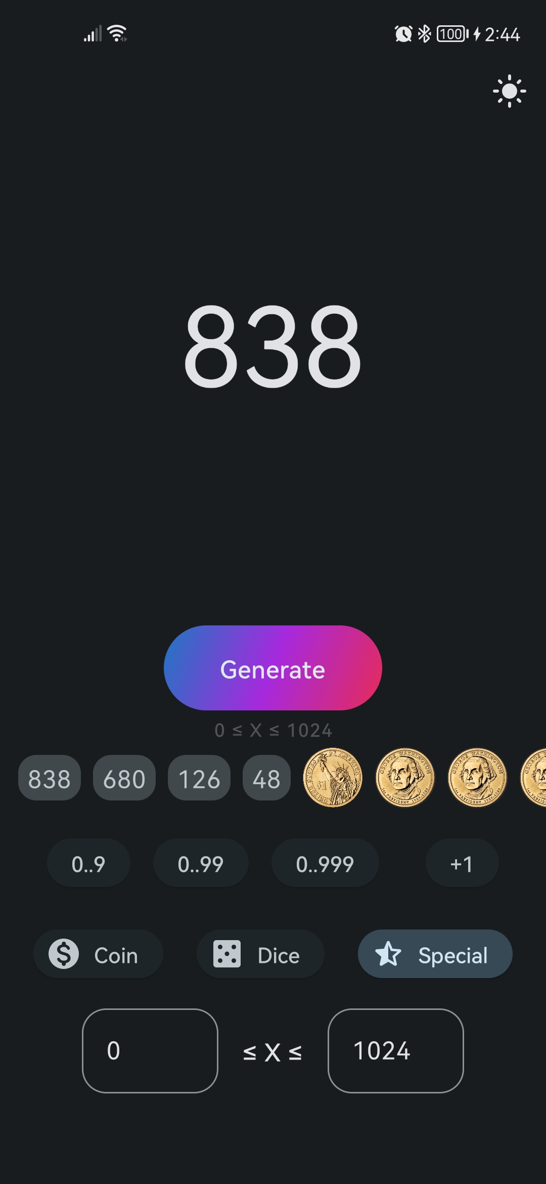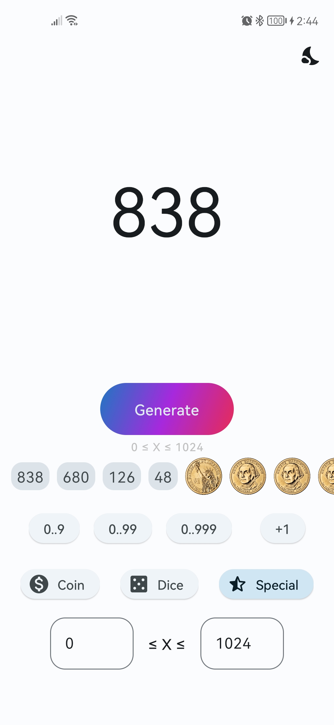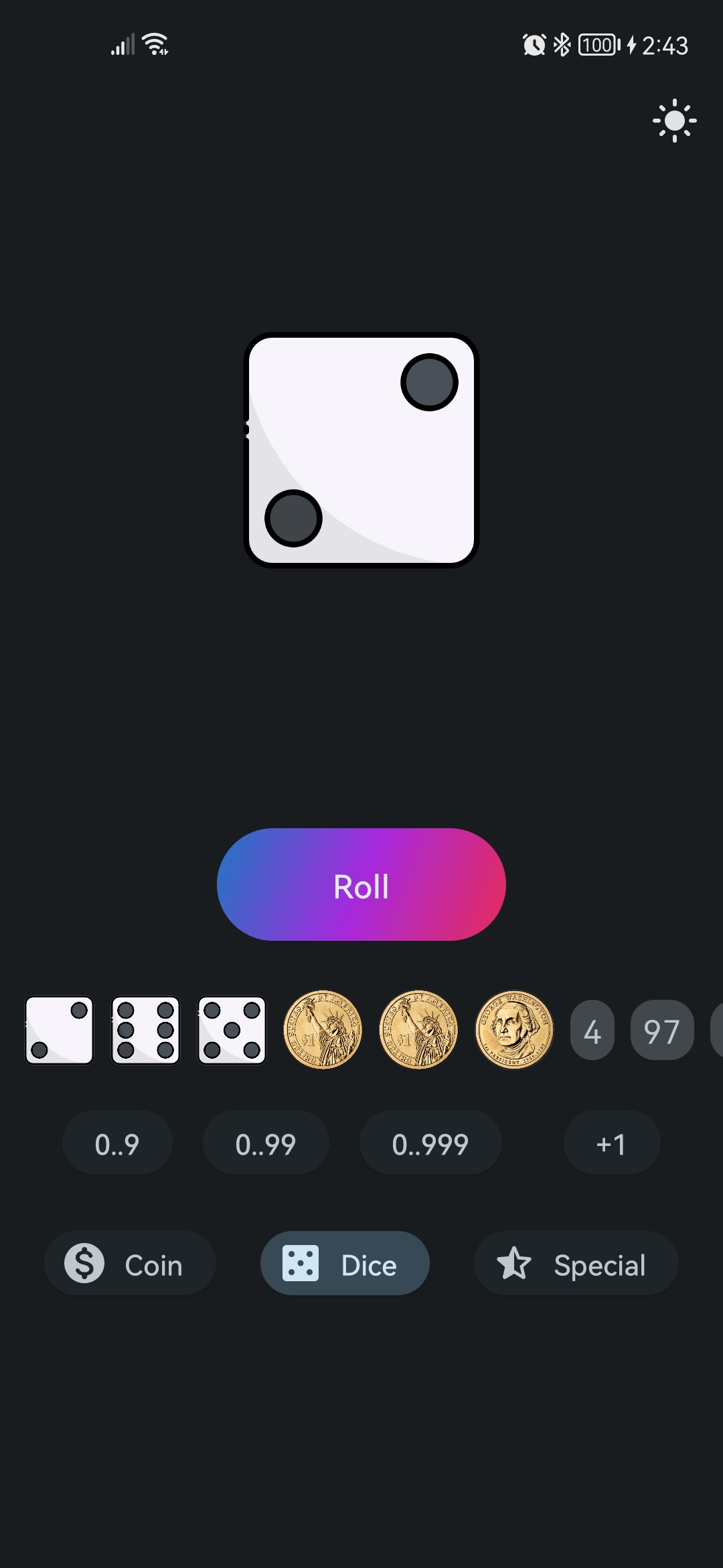 Randomizer Tech stack Kotlin, MVVM, Jetpack compose, Hilt, Accompanist, Material 3 Features generate a random number toss a coin roll a dice Download Play Market Screenshots Dark theme Light theme