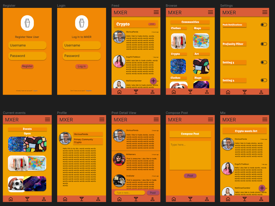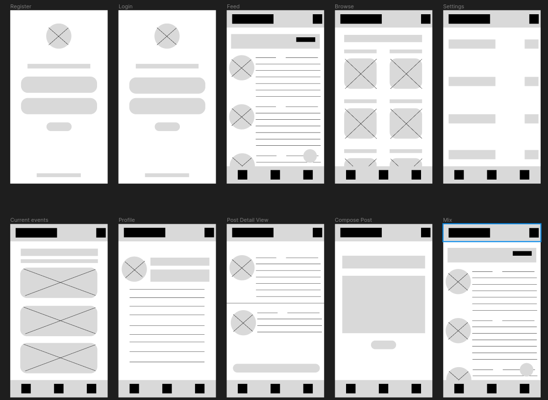 - Login/Register -> Thread/Events/Discover/Profile/Settings