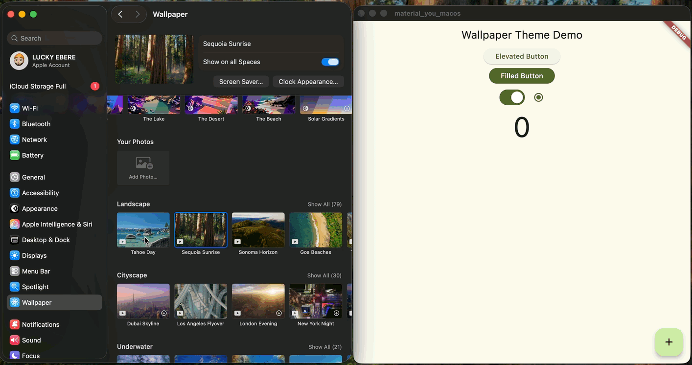 This is an experimental project that generates Material 3 color scheme from the current wallpaper on macOS. The goal is to build apps that adapt their theme to whatever wallpaper that is set.