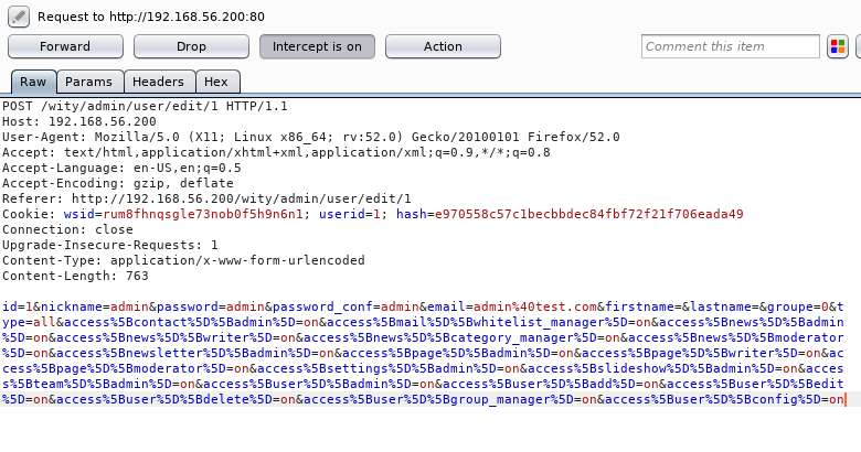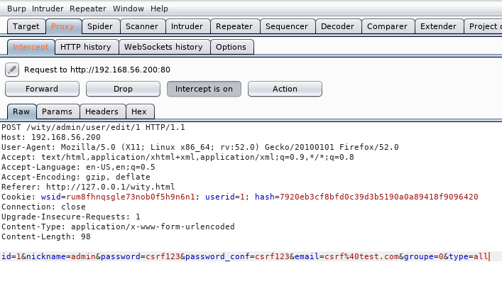 Let user access CSRF POC in attacker’s site and then POST request will be generated and requested to http://192.168.56.200/wity/admin/user/edit/1