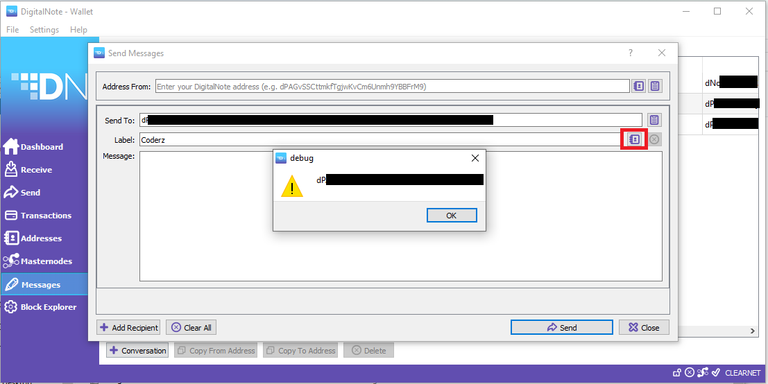 Select the address book and select an address to send to and get a debug popup with the address on it...
