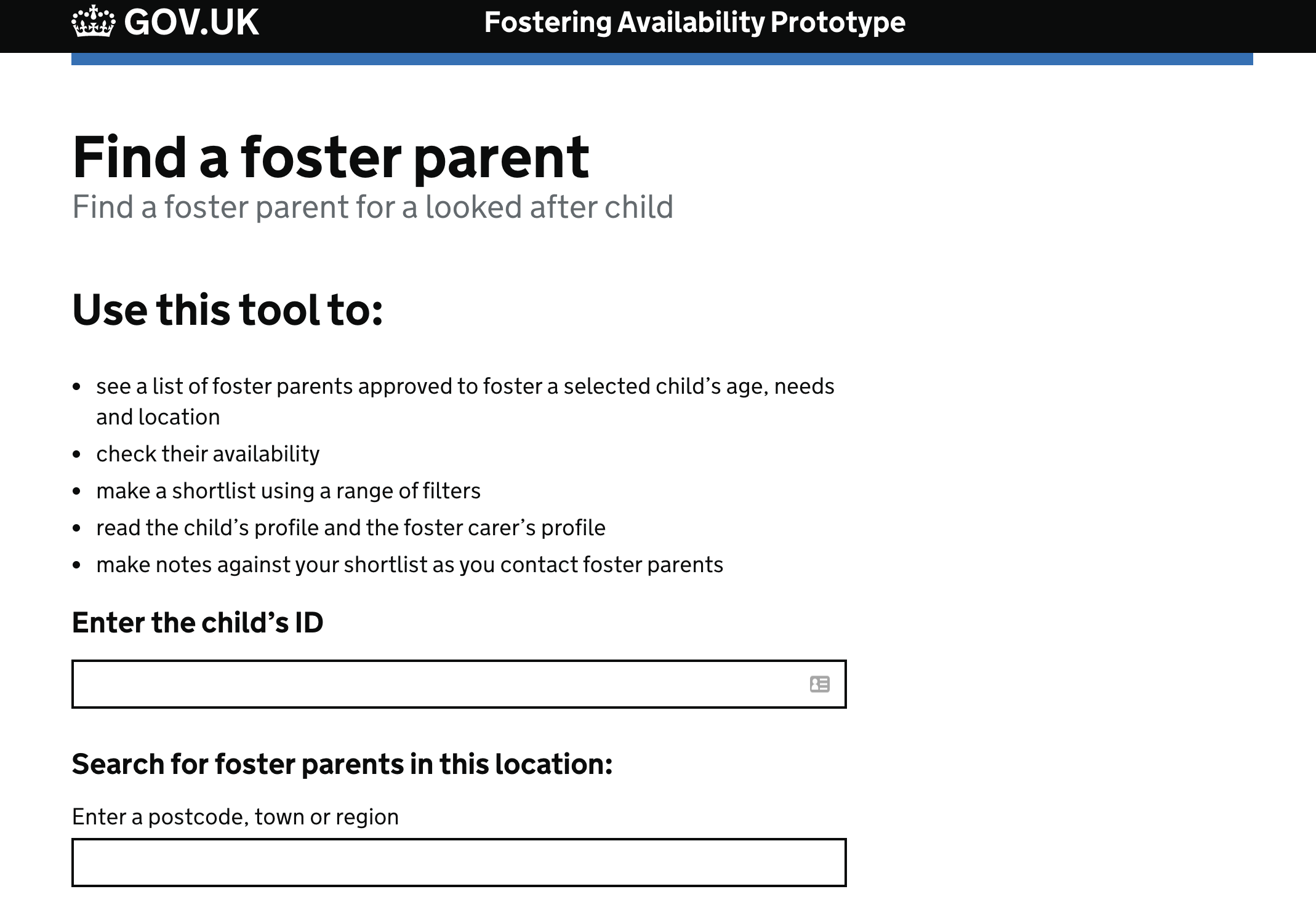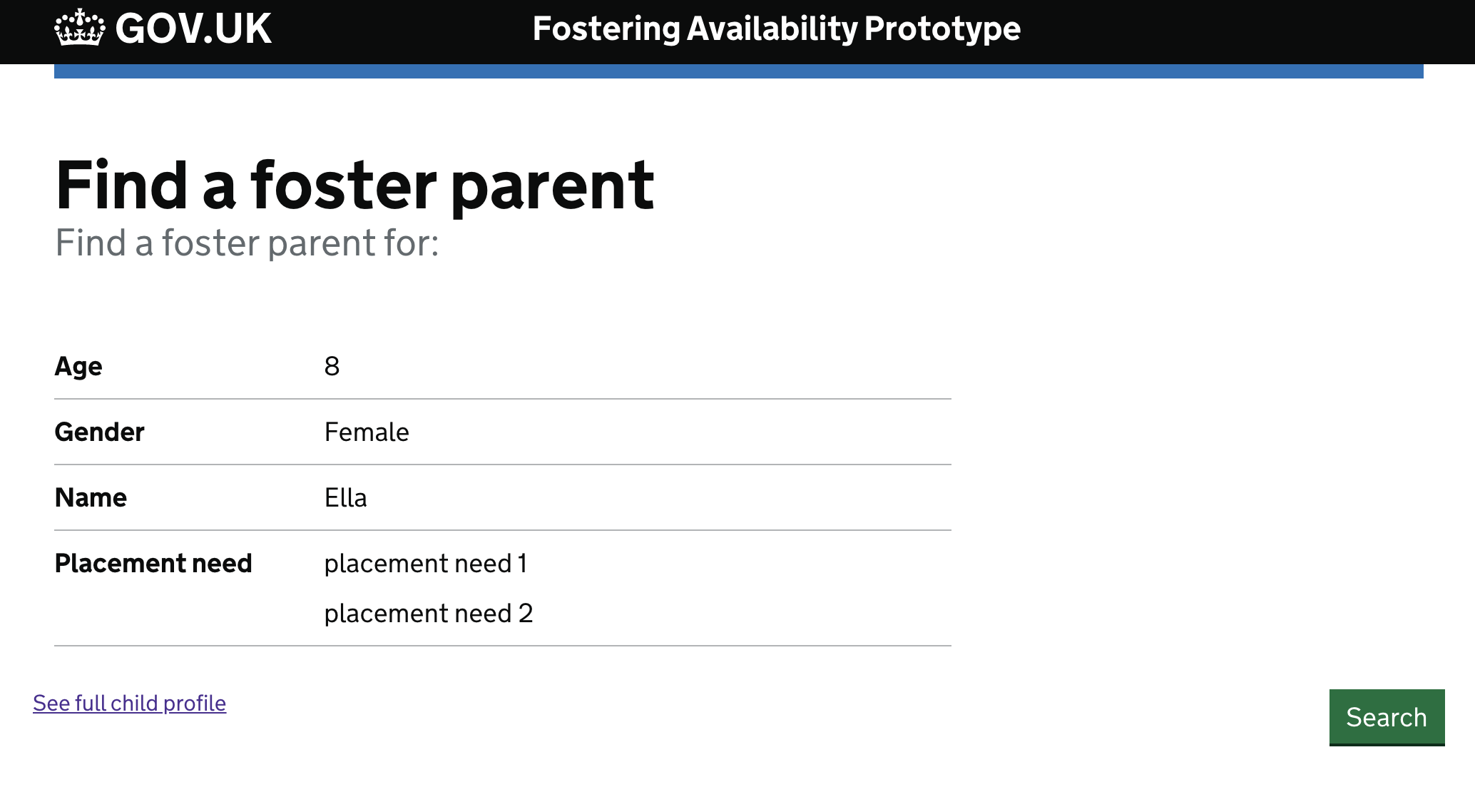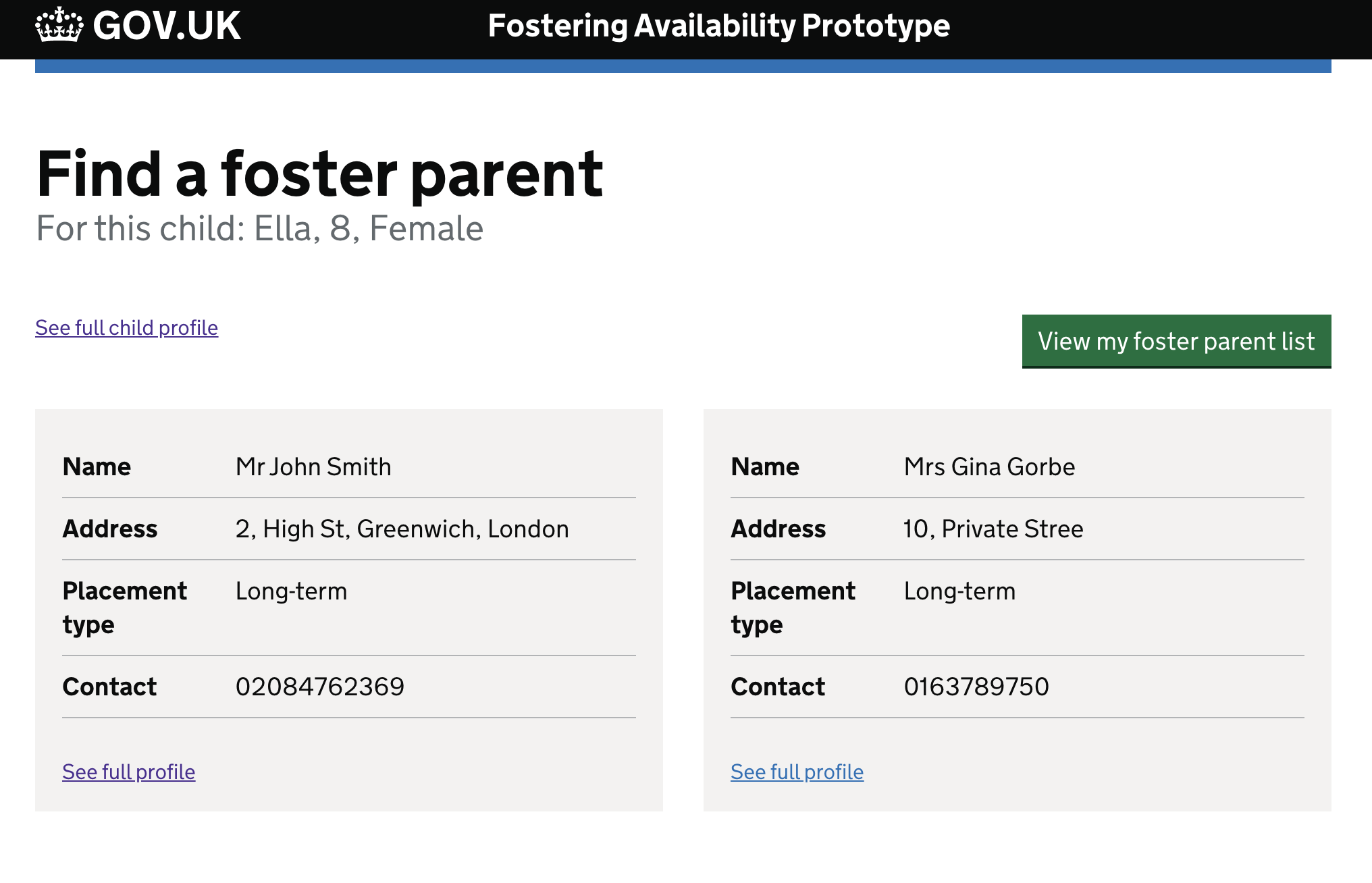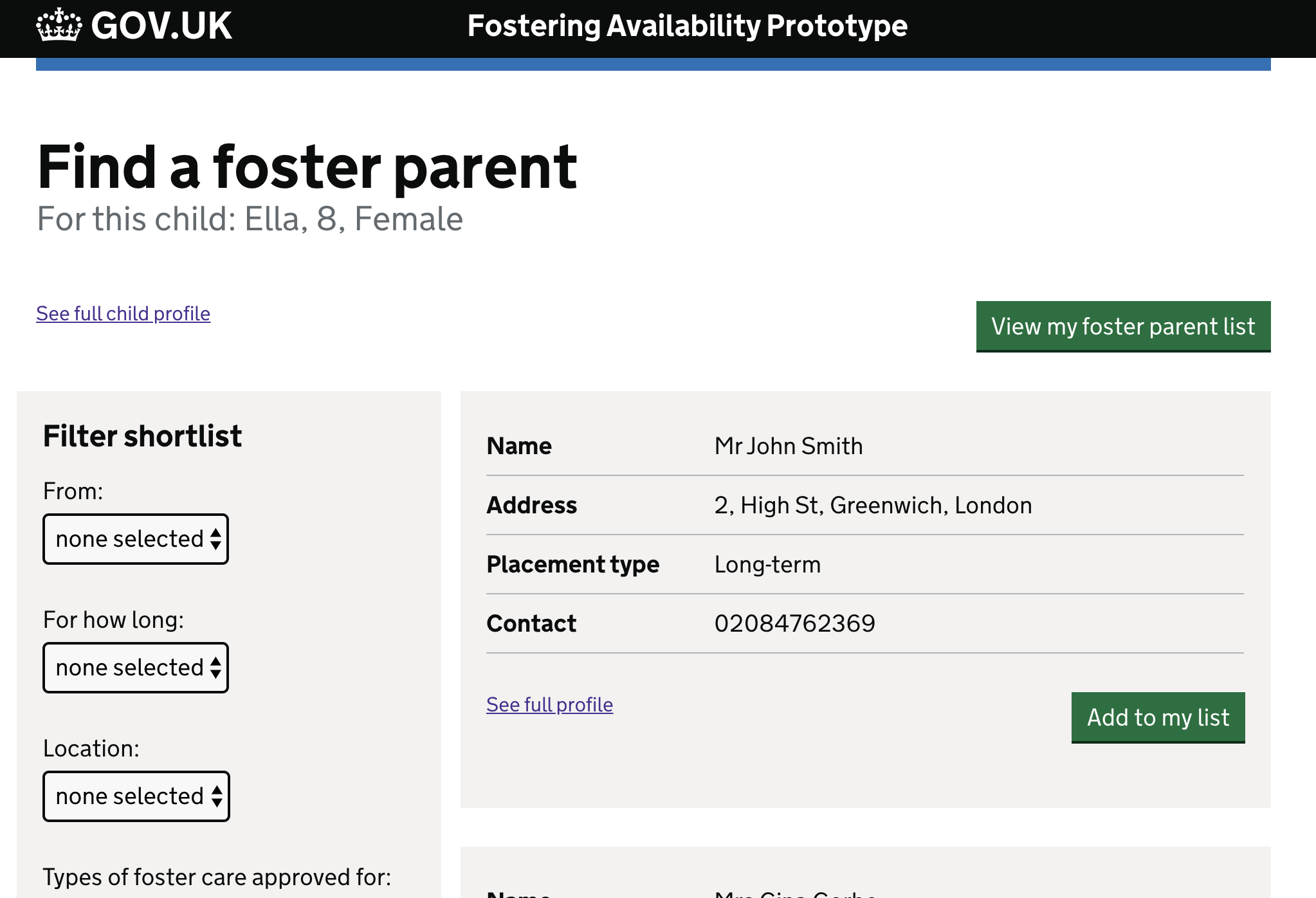 Prototype to enable key user journey and functionality to filter foster parent profiles that match a child's profile, creating a shortlist that authorities can use to aid successful child placements.