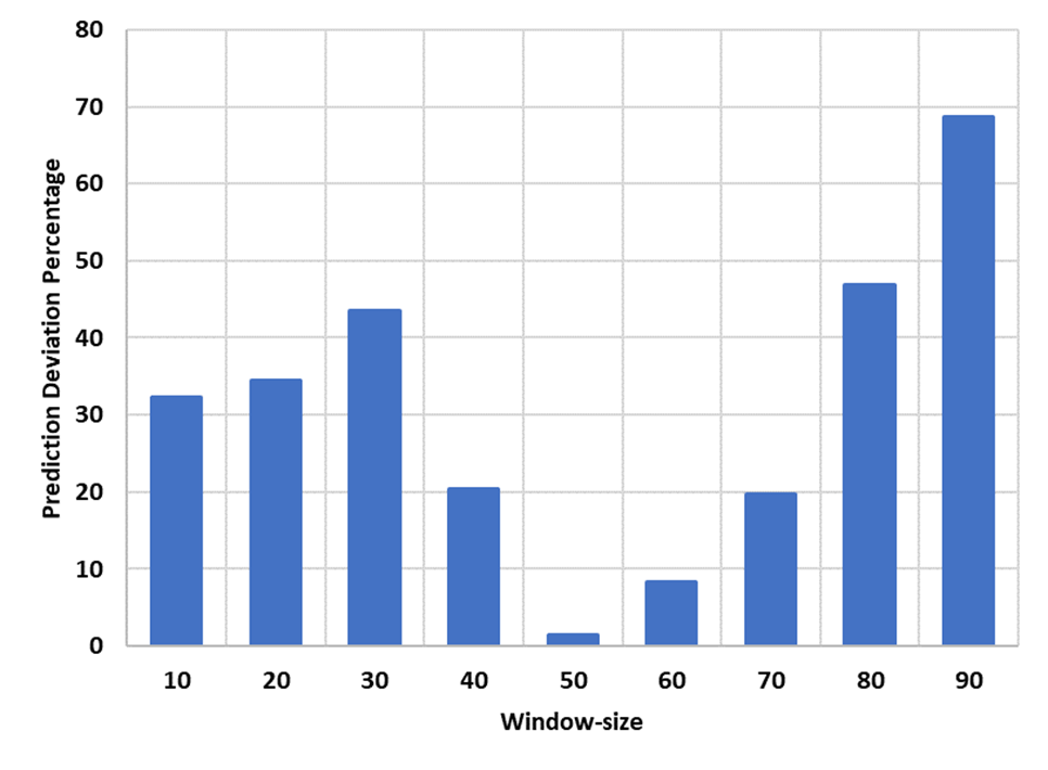 - When the experimental results are examined on the graph in Figure above,prediction deviation was at least half the number of neurons when window-size was used, and there was a deviation of approximately 1.5% in this value. Usually, a deviation below 50% is obtained, while the window-size, when the number of neurons rises to 90% or more, the prediction deviation is above this value. As a result of this experiment, it was proved that the optimum value of window-size is half the number of neurons to keep the prediction throughput at maximum.