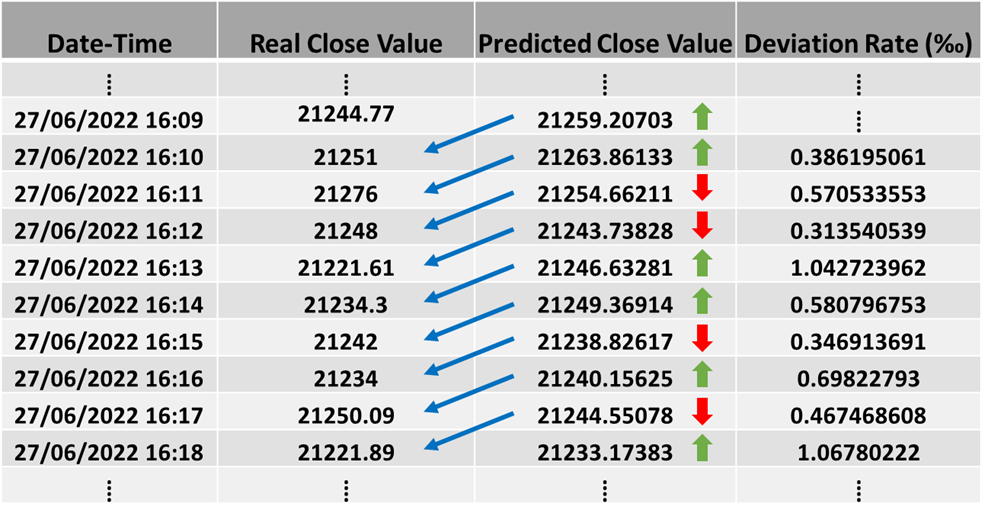 - Result of the experiment is shown in the table above. The real and predicted close parameters of BTC-USD are compared in the table. Predicted close values show the data which is prediction of the actual value after 1 minute, and this is also indicated by blue arrows. The deviation rate values are shown as permillage and are often less than 1‰. When the rise and fall intervals of the real values are examined in the table; The green upward arrows which are next to predicted values indicate that BTC-USD will rise after 1 minute, and red downward arrows indicate that it will fall after 1 minute.