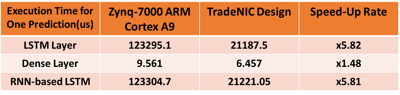 The entire algorithm spent about 123.3 milliseconds on the ZynQ7 only processor of the SoC to make a prediction by using 50 window-size. After the hardware acceleration was applied, the prediction time accelerated by x5.81 times and decreased to 21.22 milliseconds. The execution time of the dense layer decreased from about 9.5 us to 6.5 us.