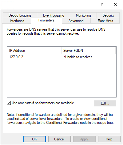 However, this meens that the listen address can not be set from the application any more. We used to run DNSCrypt in a domain environment and the listening IP/port was set to 127.0.0.2:53, which was then accessed by Microsoft DNS server as the forwarder. (as shown above)