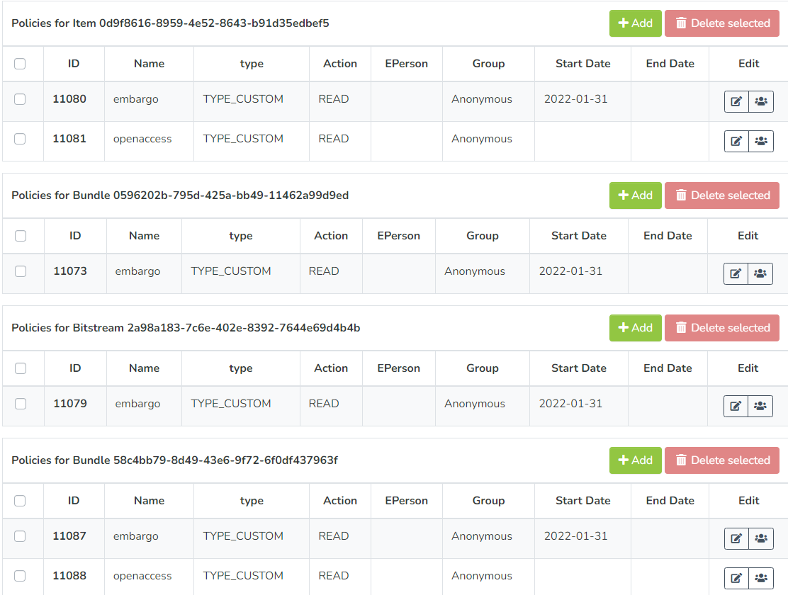 ORIGINALBundle and any Bitstreams in that Bundle. (However, other bundles, likeLICENSEproperly inherit all access permissions.)- I'm not yet sure whether this is a frontend or backend bug. But, it's unexpected behavior, as you don't know which access permissions will be applied to the ORIGINAL Bitstreams...it seems to be whichever access permission you apply first.