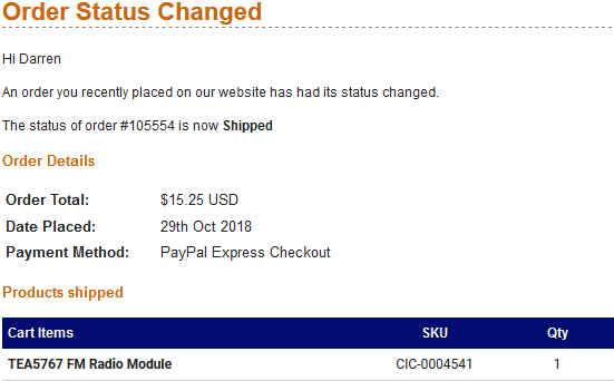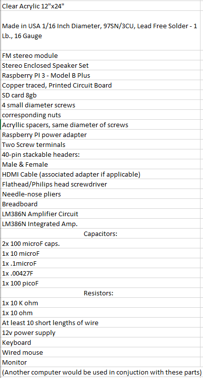 This list will allow you to complete a working FM Radio Receiver using the Raspberry PI 3b+ in conjunction with a TEA5767 I2C device.