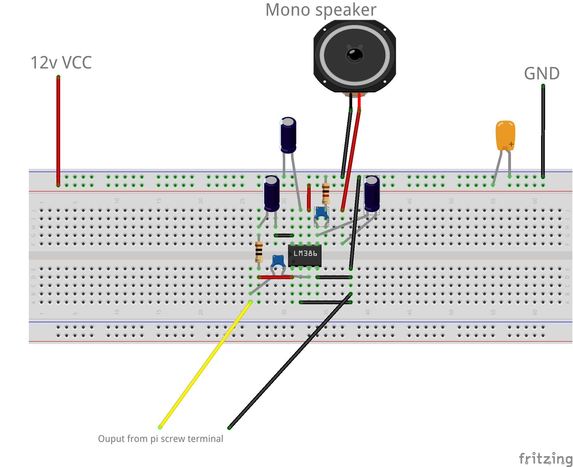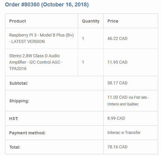 Youre budget will vary from mine, as I had a number of components and tools and access to a prototyping lab which greatly decreased my overhead costs. I also had to buy additional components that were not originally on the budget or parts list files that I have uploaded HERE on my repository. As well, my major mistake of frying a Raspberry PI (which could set you back another $50.00) wasn't included in the budget. The amplifier originally was planned to be the Class-D amp supplied by buyapi.ca, however I had to put togther the LM386 due to time contraints. However, looking back, this would be a better option; thats why I left it on the final parts list. My total budget by the end of the project was $122.68CAD. I had intitially proposed a $108 total budget.