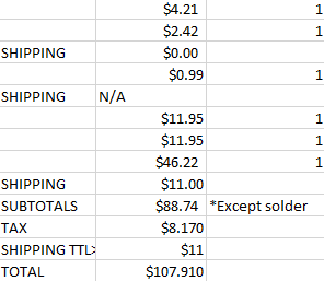 Here is the updated budget These are the costs to be expected, at least at a minimum. This was the first attempt at wrangling up some of these cheap sensors. I went for the cheapest option, and they never arrived.