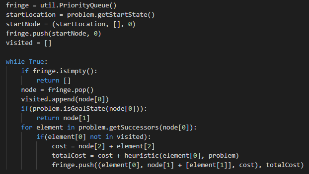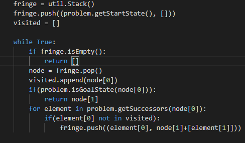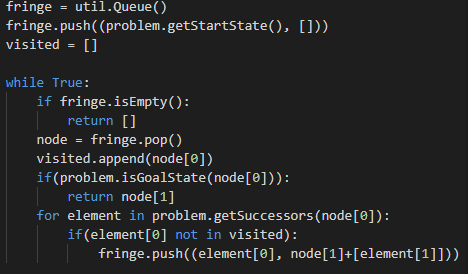 Bắt đầu vòng lặp while: nếu fringe rỗng thì return luôn. Sau đó pop đỉnh đầu trong fringe ra vào gọi nó là node, cho vào visisted. Nếu nó là đích luôn thì tìm kiếm thành công, còn không thì duyệt tất cả các thành phần con của node không thuộc fringe và visited, push nó vào đầu fringe như trong code