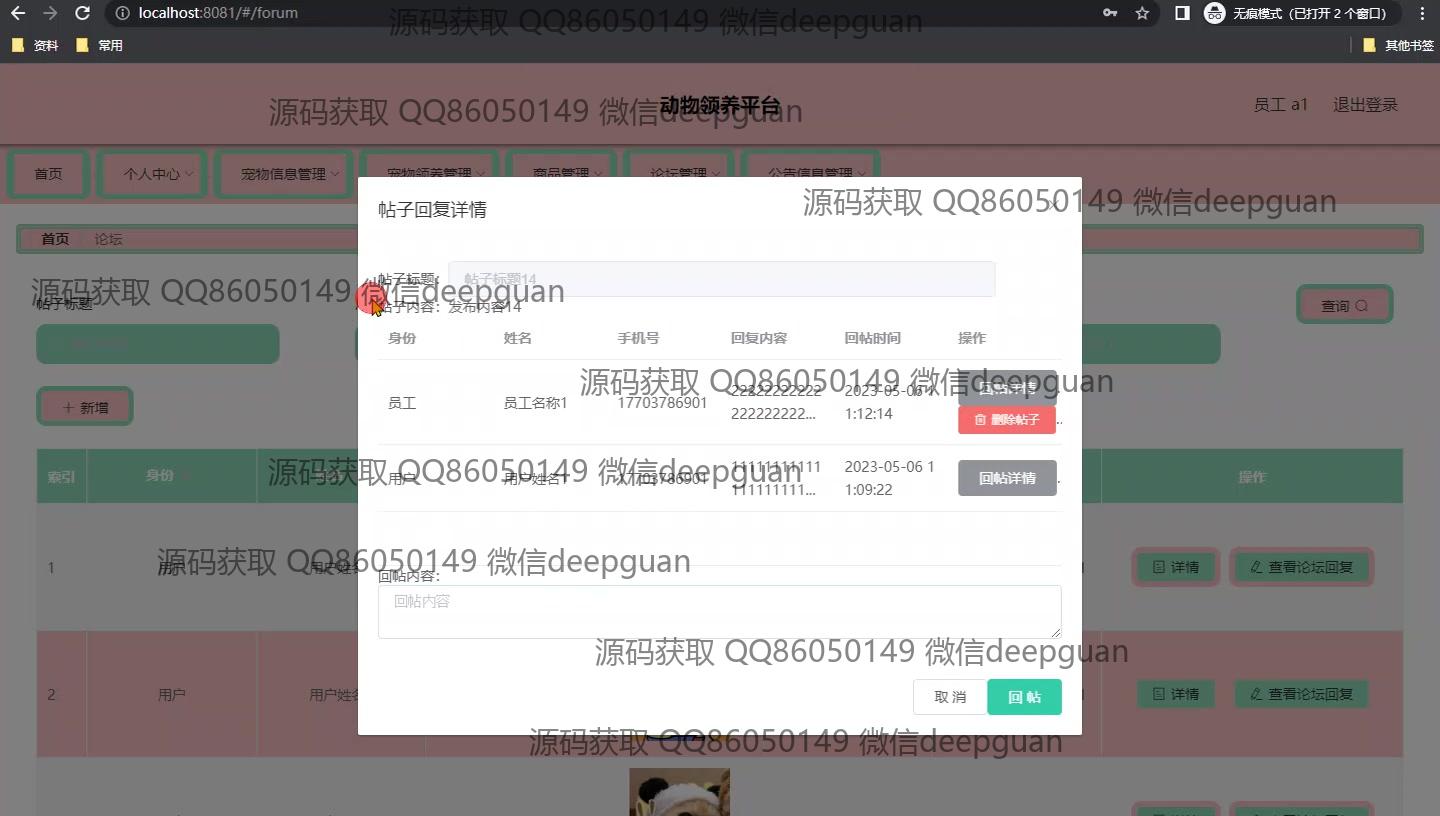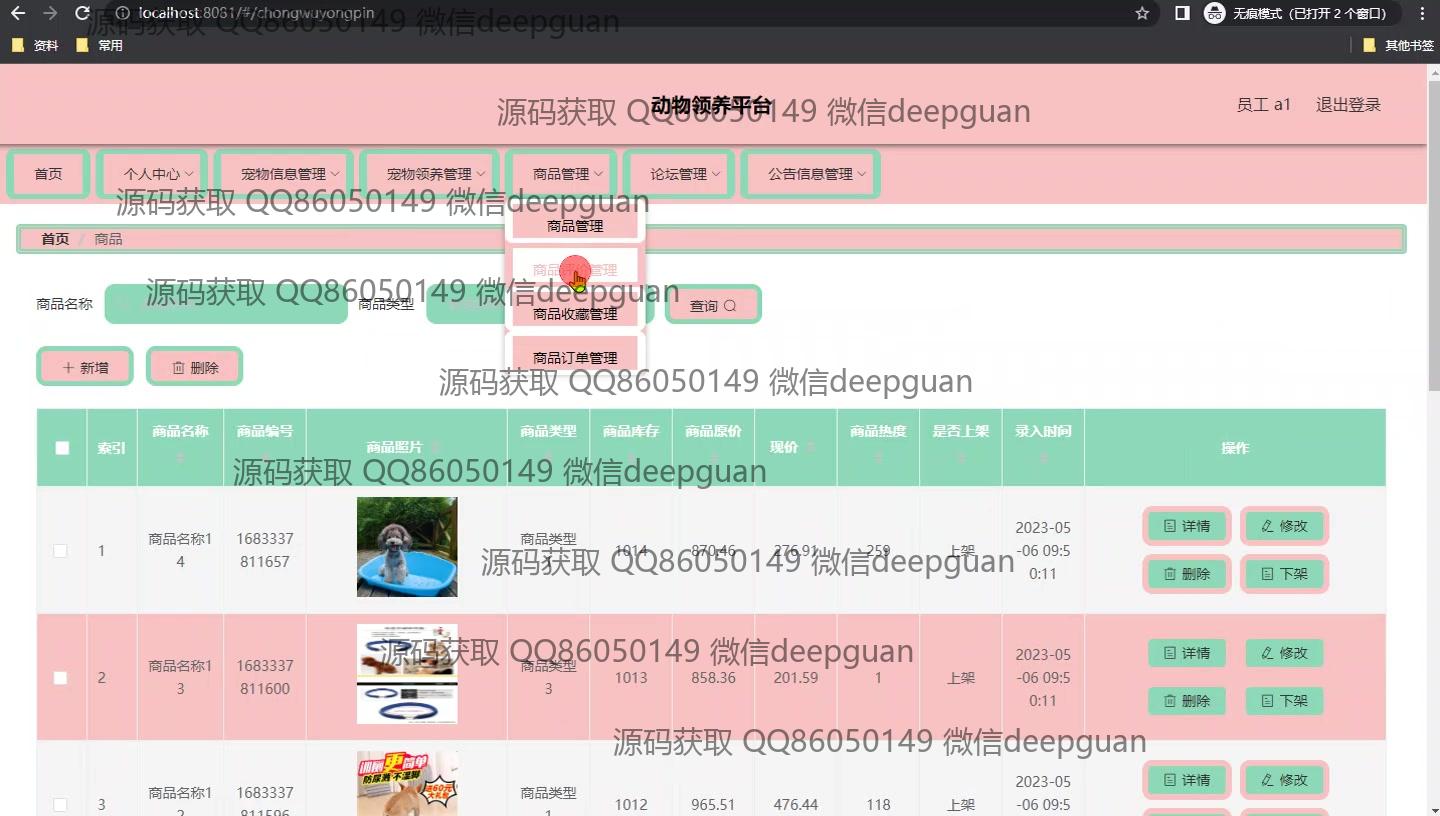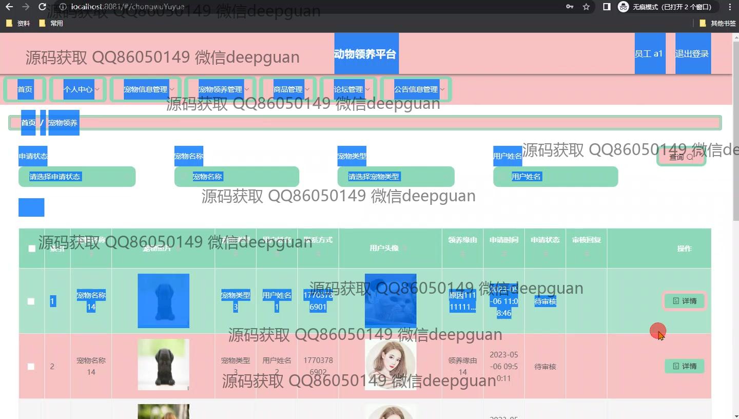 管理员:负责管理整个平台,包括用户和员工管理、商品与宠物信息管理、公告及论坛管理。可以通过导航栏访问不同的管理模块,如审批领养申请、管理帖子和回复,以及查看和编辑员工信息。提供添加、删除、修改、审核等操作权限,并可以发布和维护公告信息。具备查看和处理订单、商品类型、宠物领养申请的能力。
