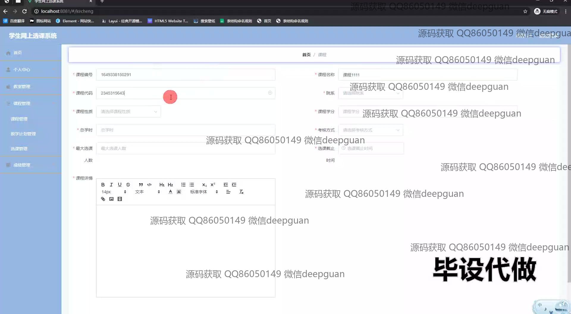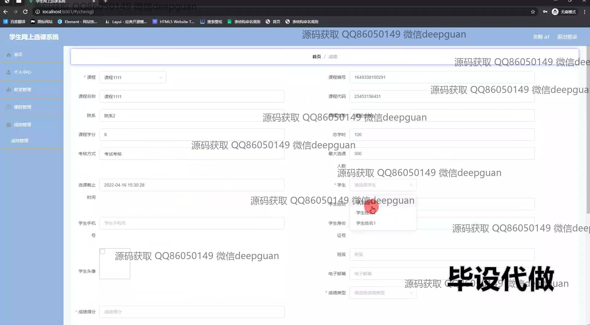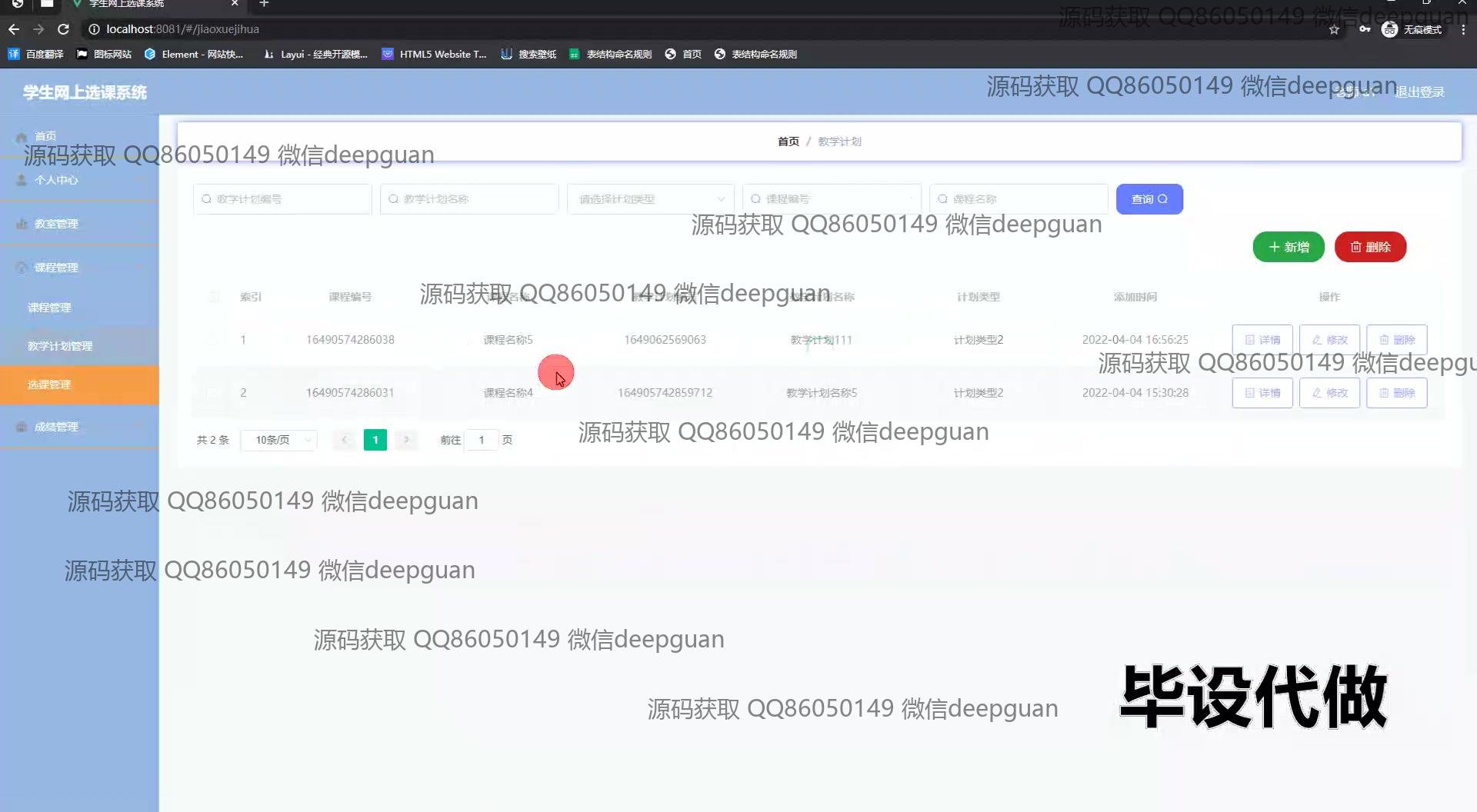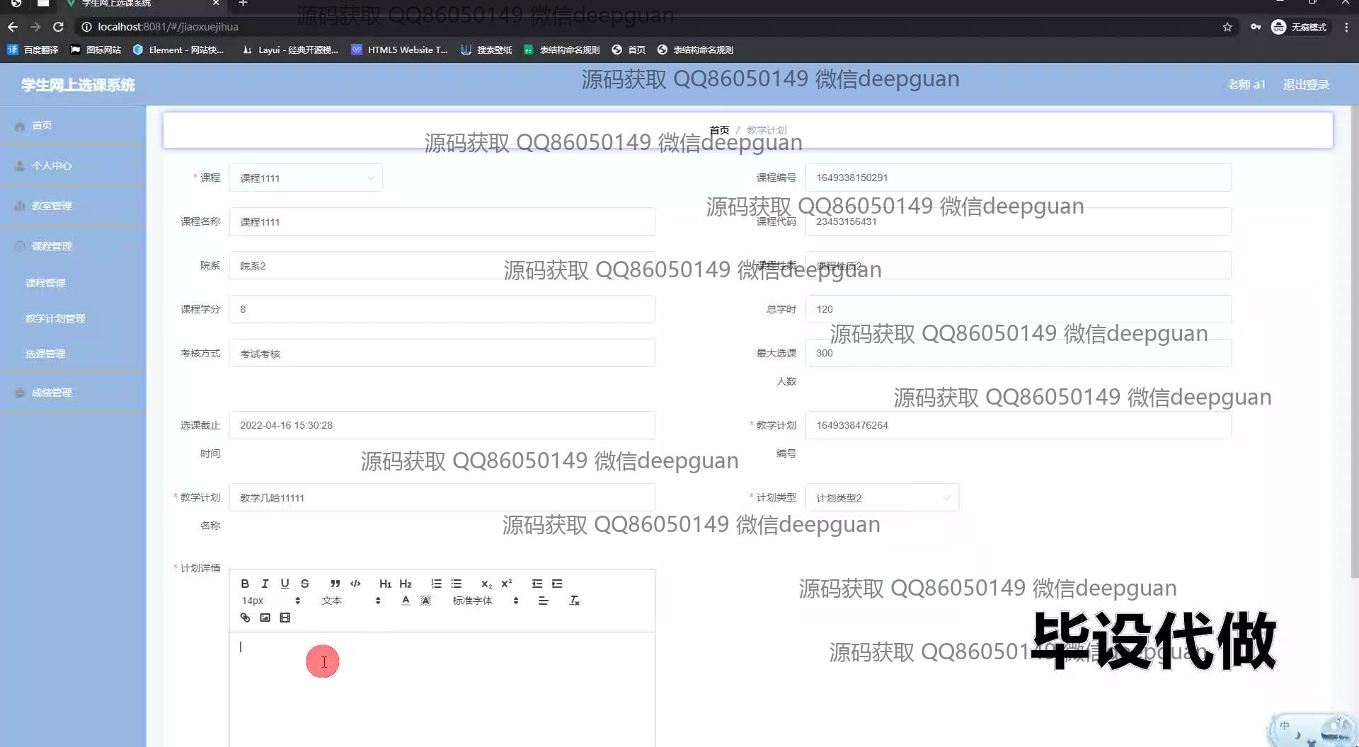 学生网上选课系统:角色分为管理员、教师、学生;功能包括个人信息管理、课程管理、选课管理、成绩管理、教学计划管理、教室管理,支持用户注册和登录。界面简洁直观,便于信息录入和查询。 --计算机毕业设计源码;毕设源码;java毕业设计源码