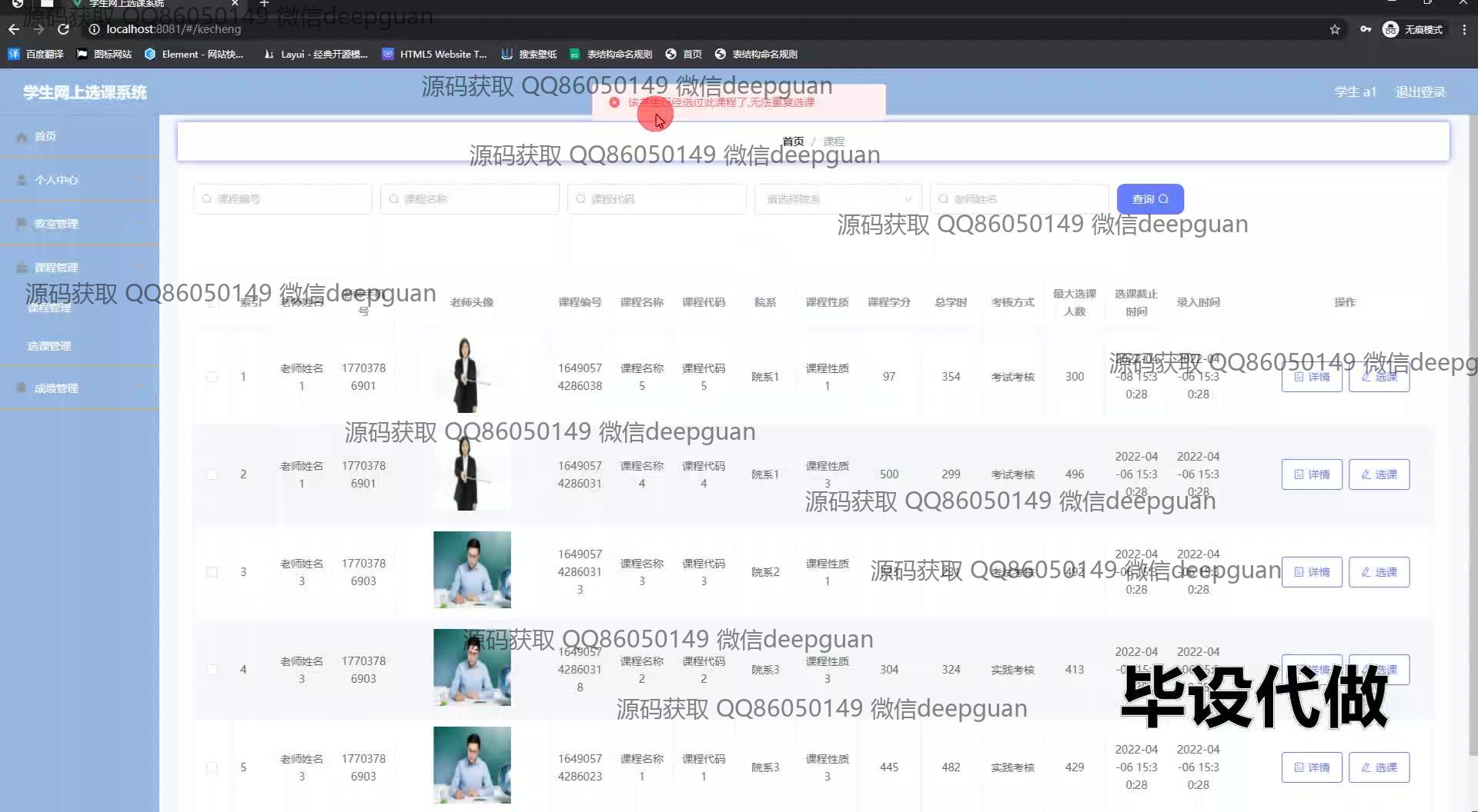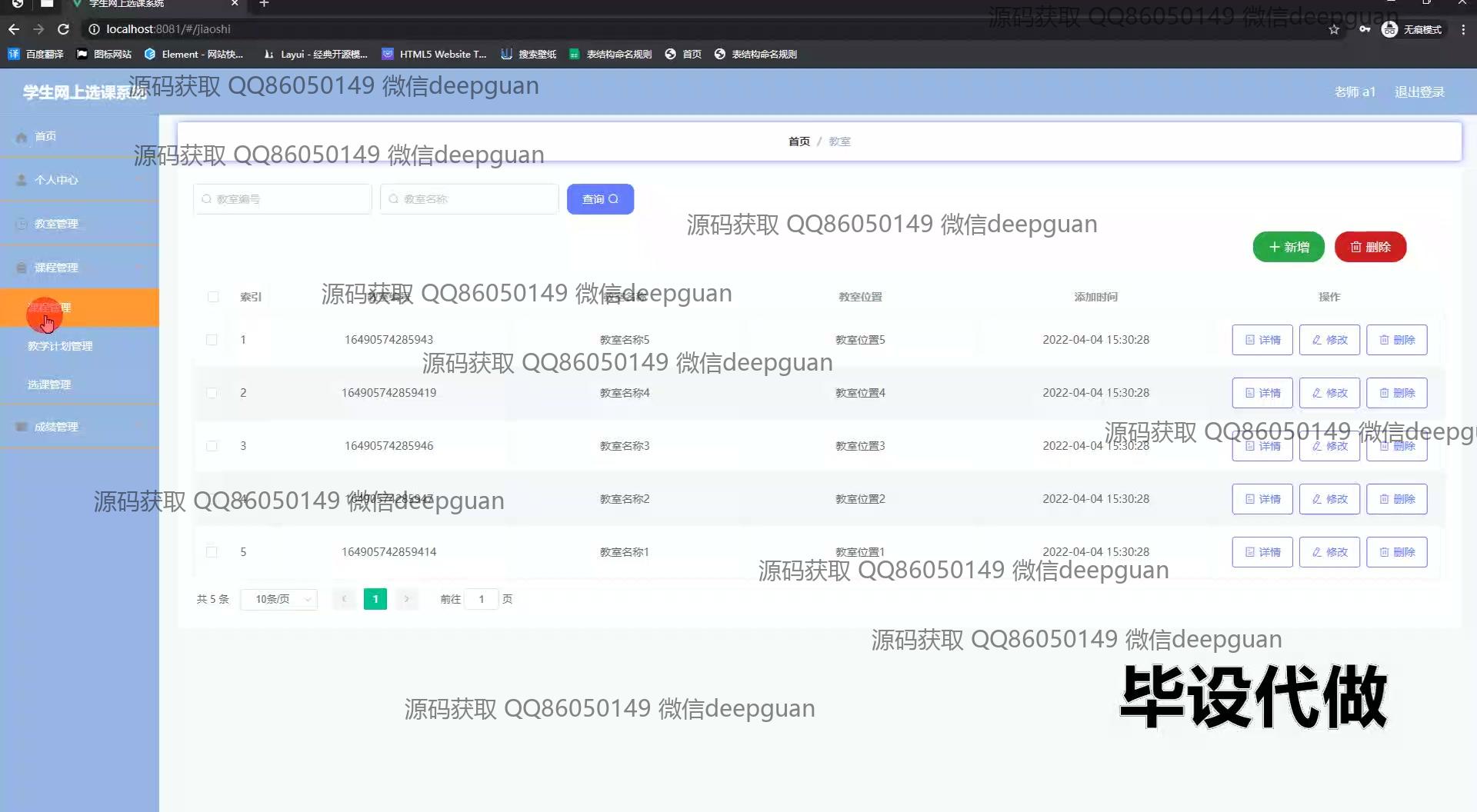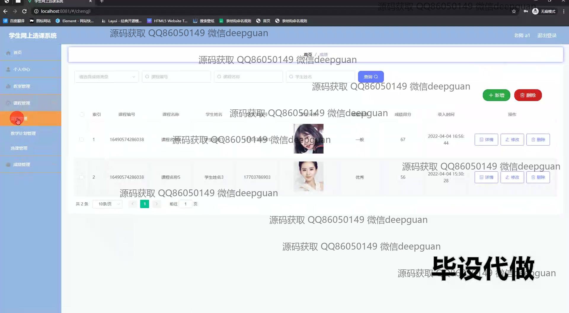学生网上选课系统:角色分为管理员、教师、学生;功能包括个人信息管理、课程管理、选课管理、成绩管理、教学计划管理、教室管理,支持用户注册和登录。界面简洁直观,便于信息录入和查询。 --计算机毕业设计源码;毕设源码;java毕业设计源码