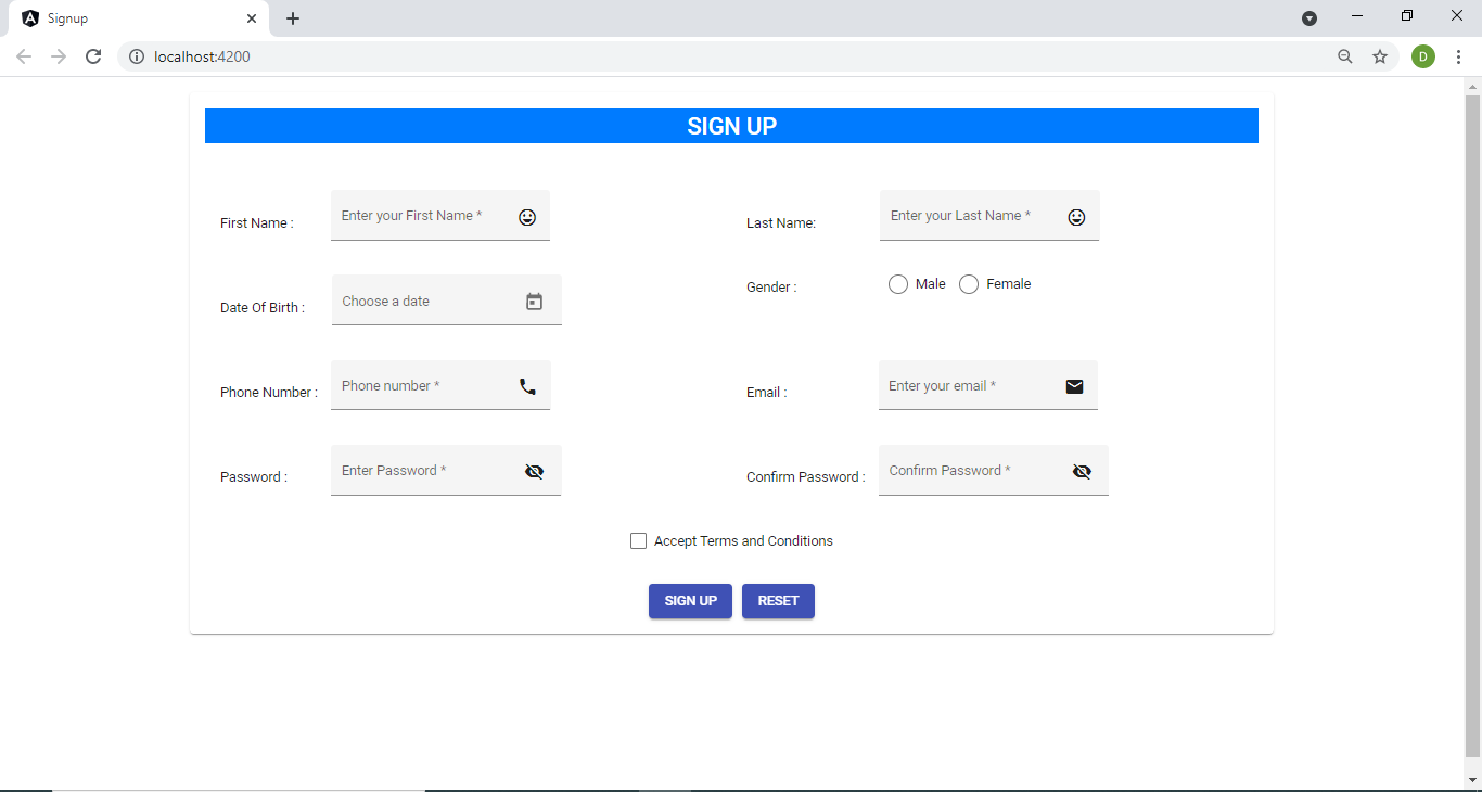 The SIGN UP form using Angular Material UI with Validation Error messages.