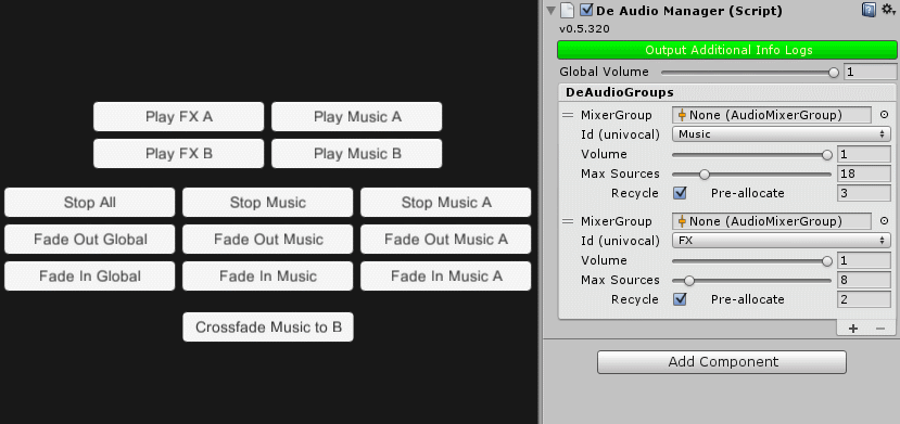 DeAudioManager has a bunch of static methods to control global settings, groups, or clips. You can also directly use methods on sound groups (DeAudioGroup) or sources (DeAudioSource).