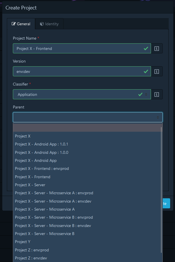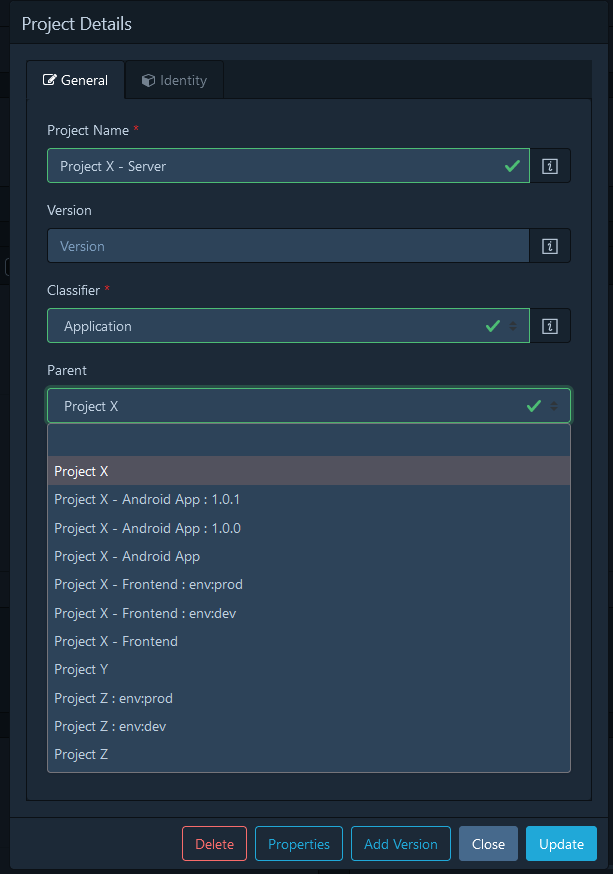 Added new select inputs in the dialogs for creating a project or showing its details, which include every possible parent for the current or new project and create a persistent relationship between them on selection.