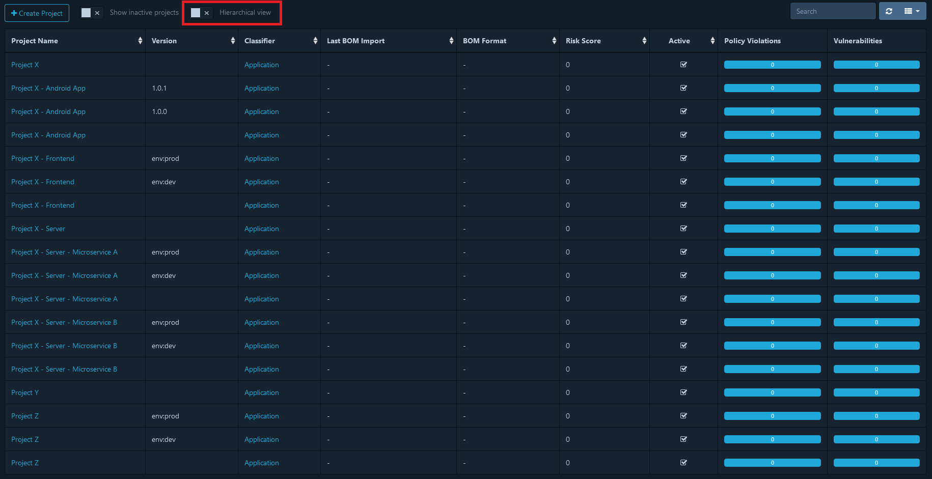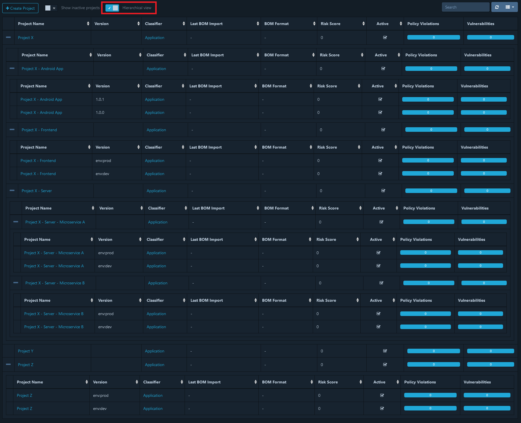 commit c5c5ab3 Merge: 0bf649a 622f275 Author: Niklas <nscuro@protonmail.com> Date: Tue Oct 18 18:57:26 2022 +0200 Merge pull request DependencyTrack#290 from nscuro/revert-272 commit 622f275 Author: nscuro <nscuro@protonmail.com> Date: Tue Oct 18 18:12:27 2022 +0200 Revert "Merge pull request DependencyTrack#272 from rbt-mm/master-show-hierarchical-view-in-project-list" This reverts commit 58b8940, reversing changes made to 3a64bbc. Signed-off-by: nscuro <nscuro@protonmail.com> commit 0bf649a Merge: 58b8940 b03b122 Author: Niklas <nscuro@protonmail.com> Date: Tue Oct 18 17:51:34 2022 +0200 Merge pull request DependencyTrack#274 from rbt-mm/master-limit-alert-rules-to-project-including-all-existing-or-future-versions Include a projects children in an alert rules limitations commit 58b8940 Merge: 3a64bbc abfe53c Author: Niklas <nscuro@protonmail.com> Date: Tue Oct 18 17:46:59 2022 +0200 Merge pull request DependencyTrack#272 from rbt-mm/master-show-hierarchical-view-in-project-list Show hierarchical view in project list commit abfe53c Author: rbt-mm <113189967+rbt-mm@users.noreply.github.com> Date: Tue Oct 18 17:05:21 2022 +0200 Hide detail view button when no active child Signed-off-by: RBickert <rbt@mm-software.com> Co-authored-by: Niklas <nscuro@protonmail.com> Signed-off-by: RBickert <rbt@mm-software.com> commit dbb34d3 Author: RBickert <rbt@mm-software.com> Date: Tue Oct 4 17:56:55 2022 +0200 Change prototype method in project list Do not access Object.prototype method 'hasOwnProperty' from target object. Only show project name in create project modal, if a project does not have a version Signed-off-by: RBickert <rbt@mm-software.com> commit a79d535 Author: RBickert <rbt@mm-software.com> Date: Tue Oct 4 17:03:10 2022 +0200 Revert "Update ci-build.yaml" This reverts commit aeccadc. Signed-off-by: RBickert <rbt@mm-software.com> commit d7b8d69 Author: RBickert <rbt@mm-software.com> Date: Fri Sep 30 16:27:18 2022 +0200 Filter detail view parents in backend Available parents in a project detail view are now filtered in the backend instead of the UI Signed-off-by: RBickert <rbt@mm-software.com> commit 87a9d8c Author: RBickert <rbt@mm-software.com> Date: Thu Sep 29 16:37:23 2022 +0200 Fix switching parent to inactive A parent project cannot be set to inactive if any of his children are set to active Signed-off-by: RBickert <rbt@mm-software.com> commit 11c7eab Author: RBickert <rbt@mm-software.com> Date: Fri Sep 23 16:28:37 2022 +0200 Add hierarchical view in project list Added CSwitch in project list to switch between current flat view (default) and a new hierarchical view (shows root projects and their children in the detail view of a row). Project detail view only shows viable projects as selectable parent. Hierarchical project list shows inactive projects for children and children are sortable. Signed-off-by: RBickert <rbt@mm-software.com> commit ee96685 Author: RBickert <rbt@mm-software.com> Date: Tue Sep 20 17:03:51 2022 +0200 Add persistent selection of parent to detail view Send selected parent in project detail view via API call to backend to create a persistent parent-child-relationship. Signed-off-by: RBickert <rbt@mm-software.com> commit b05a11c Author: RBickert <rbt@mm-software.com> Date: Mon Sep 19 16:53:00 2022 +0200 Add parent in project creation and detail view Display list of every project in `Create Project` and `View Project` to select a parent project for the new or current project. Send selected parent in project creation via API call to backend to create a persistent parent-child-relationship. Signed-off-by: RBickert <rbt@mm-software.com> commit 053f6fa Author: rbt-mm <113189967+rbt-mm@users.noreply.github.com> Date: Wed Sep 28 13:24:38 2022 +0200 Update ci-build.yaml Workflow now starts on every pull request, if the branch name contains 'master' in it. Signed-off-by: RBickert <rbt@mm-software.com> commit b03b122 Author: RBickert <rbt@mm-software.com> Date: Tue Oct 18 13:11:23 2022 +0200 Make inclusion of children optional Added a switch in the alerts view which optionally includes every active child of the subscribed projects in the notification rule. Signed-off-by: RBickert <rbt@mm-software.com> commit 298c5be Merge: 54e7c51 3a64bbc Author: rbt-mm <113189967+rbt-mm@users.noreply.github.com> Date: Tue Oct 18 13:01:18 2022 +0200 Merge branch 'DependencyTrack:master' into master-limit-alert-rules-to-project-including-all-existing-or-future-versions commit 3a64bbc Merge: 8a1239c 9d78a3b Author: Niklas <nscuro@protonmail.com> Date: Tue Oct 18 10:06:35 2022 +0200 Merge pull request DependencyTrack#287 from DependencyTrack/dependabot/docker/docker/nginxinc/nginx-unprivileged-5af0906 build(deps): bump nginxinc/nginx-unprivileged from `31ac9ab` to `5af0906` in /docker commit 8a1239c Merge: 21cd1f0 0610ba0 Author: Niklas <nscuro@protonmail.com> Date: Tue Oct 18 10:06:26 2022 +0200 Merge pull request DependencyTrack#288 from DependencyTrack/dependabot/github_actions/docker/setup-buildx-action-2.2.0 build(deps): bump docker/setup-buildx-action from 2.1.0 to 2.2.0 commit 0610ba0 Author: dependabot[bot] <49699333+dependabot[bot]@users.noreply.github.com> Date: Tue Oct 18 01:33:58 2022 +0000 build(deps): bump docker/setup-buildx-action from 2.1.0 to 2.2.0 Bumps [docker/setup-buildx-action](https://github.com/docker/setup-buildx-action) from 2.1.0 to 2.2.0. - [Release notes](https://github.com/docker/setup-buildx-action/releases) - [Commits](docker/setup-buildx-action@v2.1.0...v2.2.0) --- updated-dependencies: - dependency-name: docker/setup-buildx-action dependency-type: direct:production update-type: version-update:semver-minor ... Signed-off-by: dependabot[bot] <support@github.com> commit 9d78a3b Author: dependabot[bot] <49699333+dependabot[bot]@users.noreply.github.com> Date: Tue Oct 18 01:33:57 2022 +0000 build(deps): bump nginxinc/nginx-unprivileged in /docker Bumps nginxinc/nginx-unprivileged from `31ac9ab` to `5af0906`. --- updated-dependencies: - dependency-name: nginxinc/ngi
