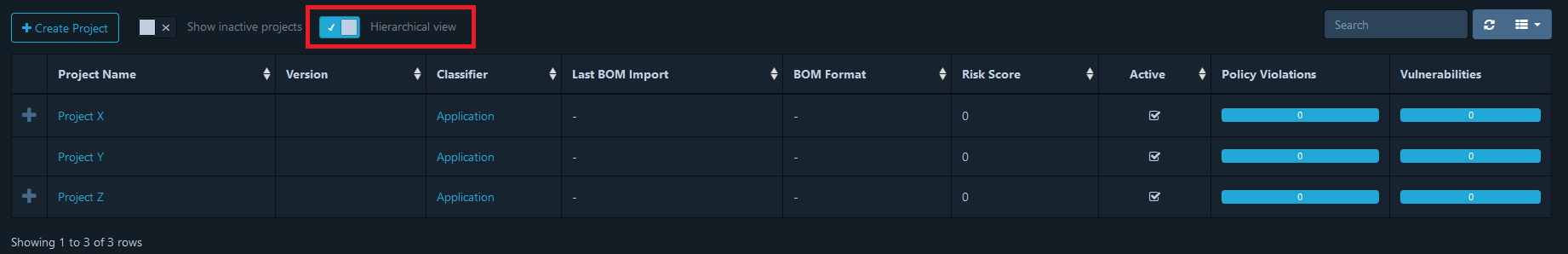 Added a switch in the project list to either display a hierarchical view, which shows the (already existing) multi-level parent-child-relationships between projects, or to display the currently existing flat view of projects.