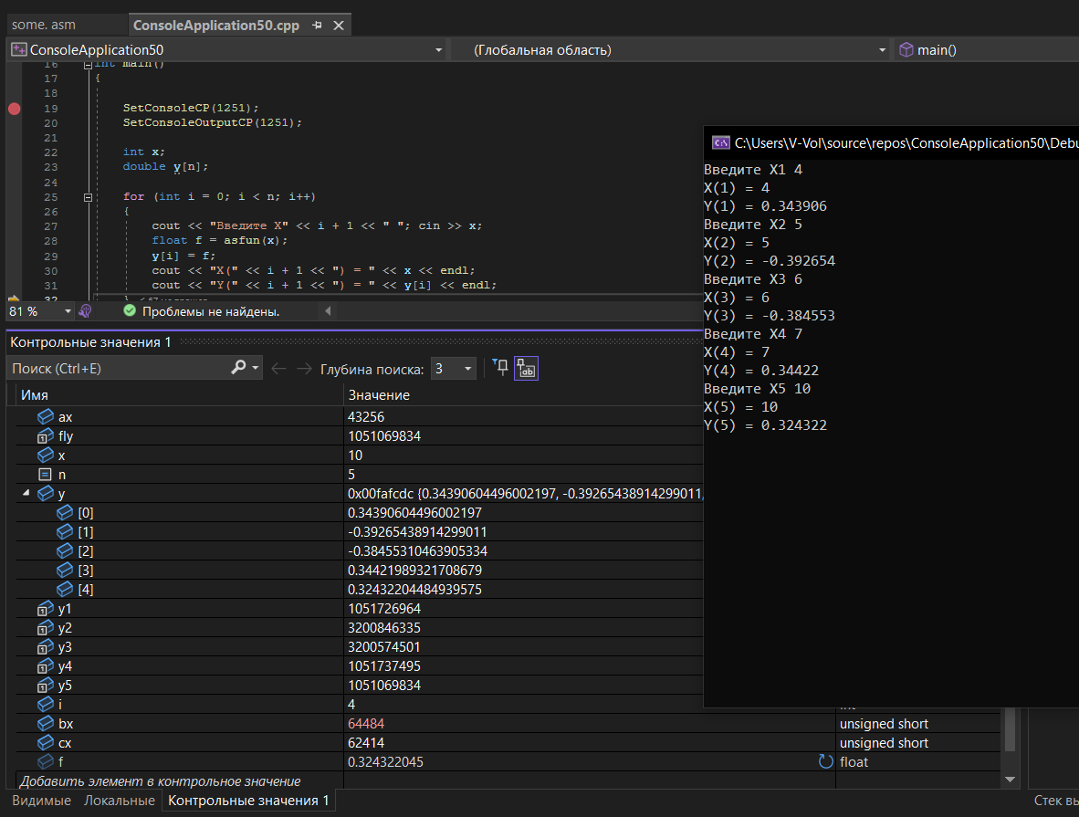 А после код Assembler возвращает значение обратно в С++, где он записывается в массив y[i]
