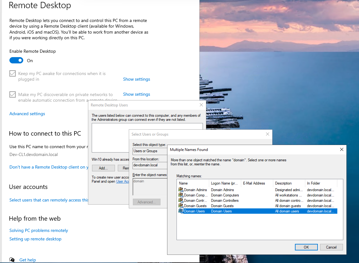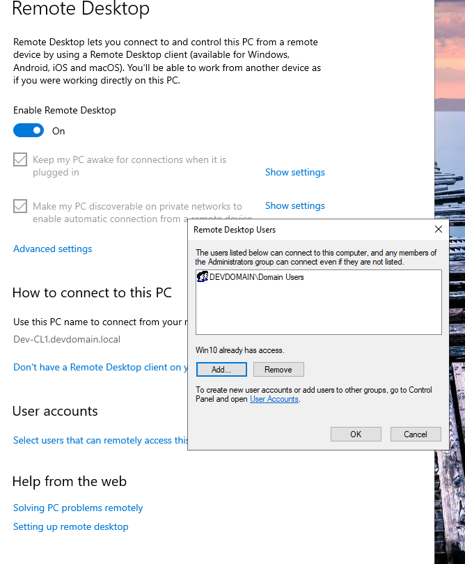 Add domain users to Win10 client through Remote Desktop and restart Win10 Client