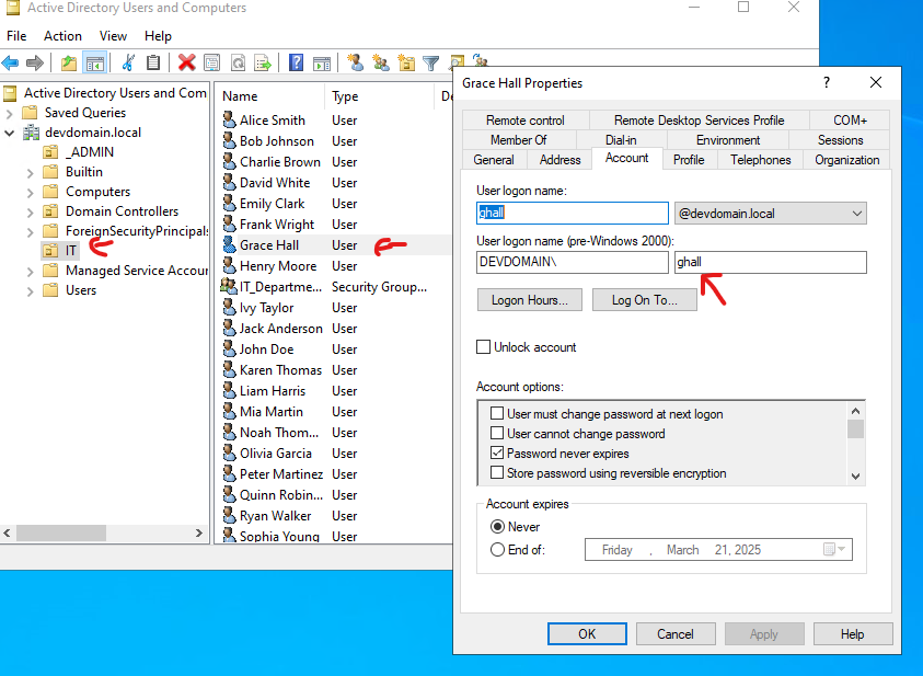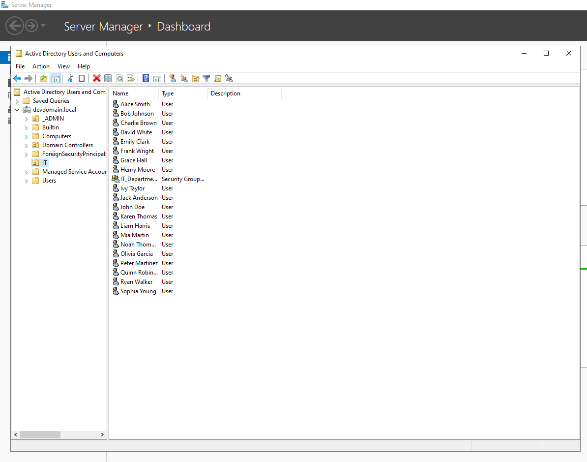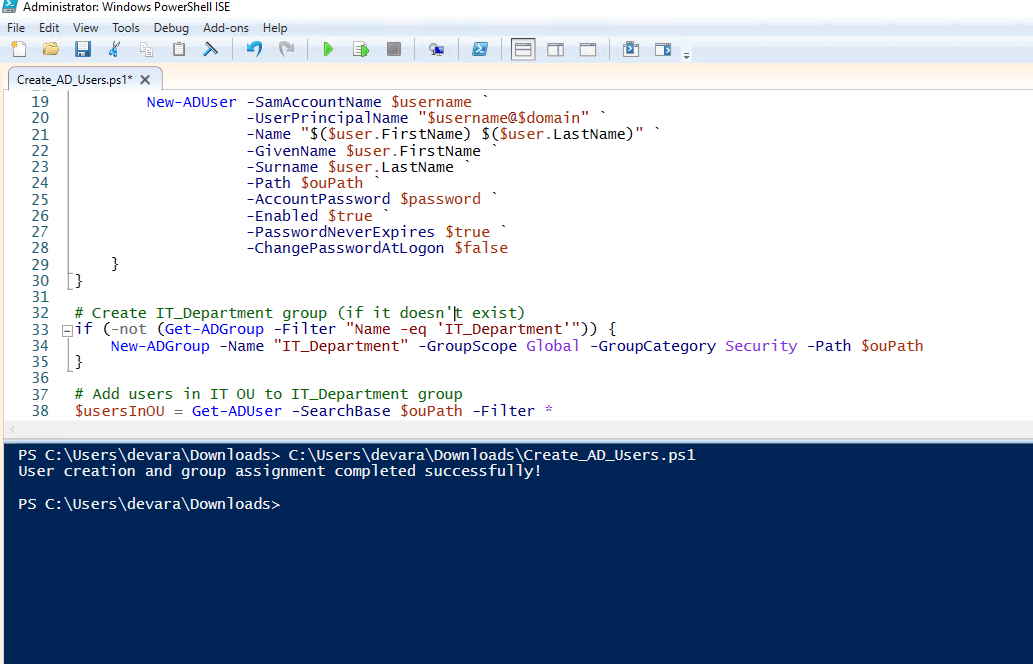 It also shows the use of powershell automation scripts to create 20 users, set passwords, create an organization called IT and also a group. These users were given secure and least privilege access needed to operate the Win10 client and the access was verified.