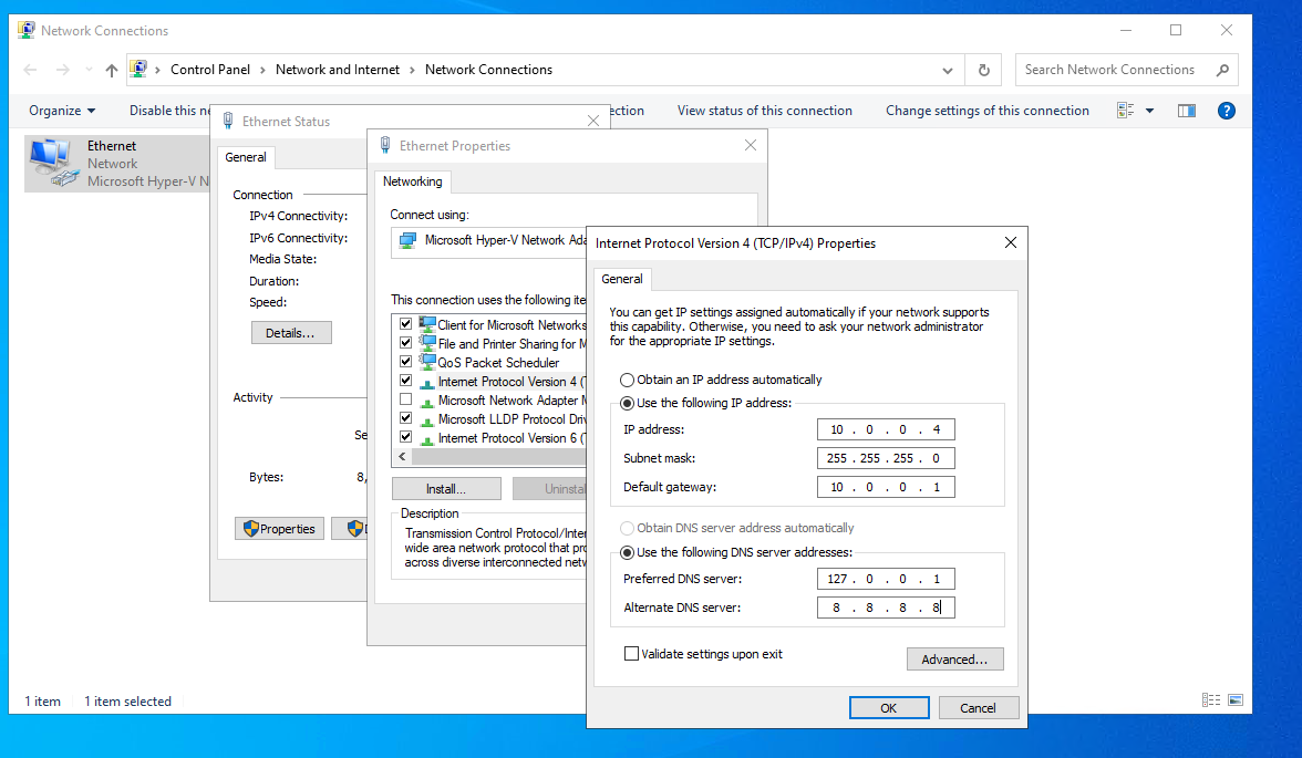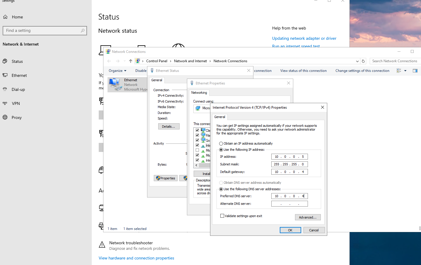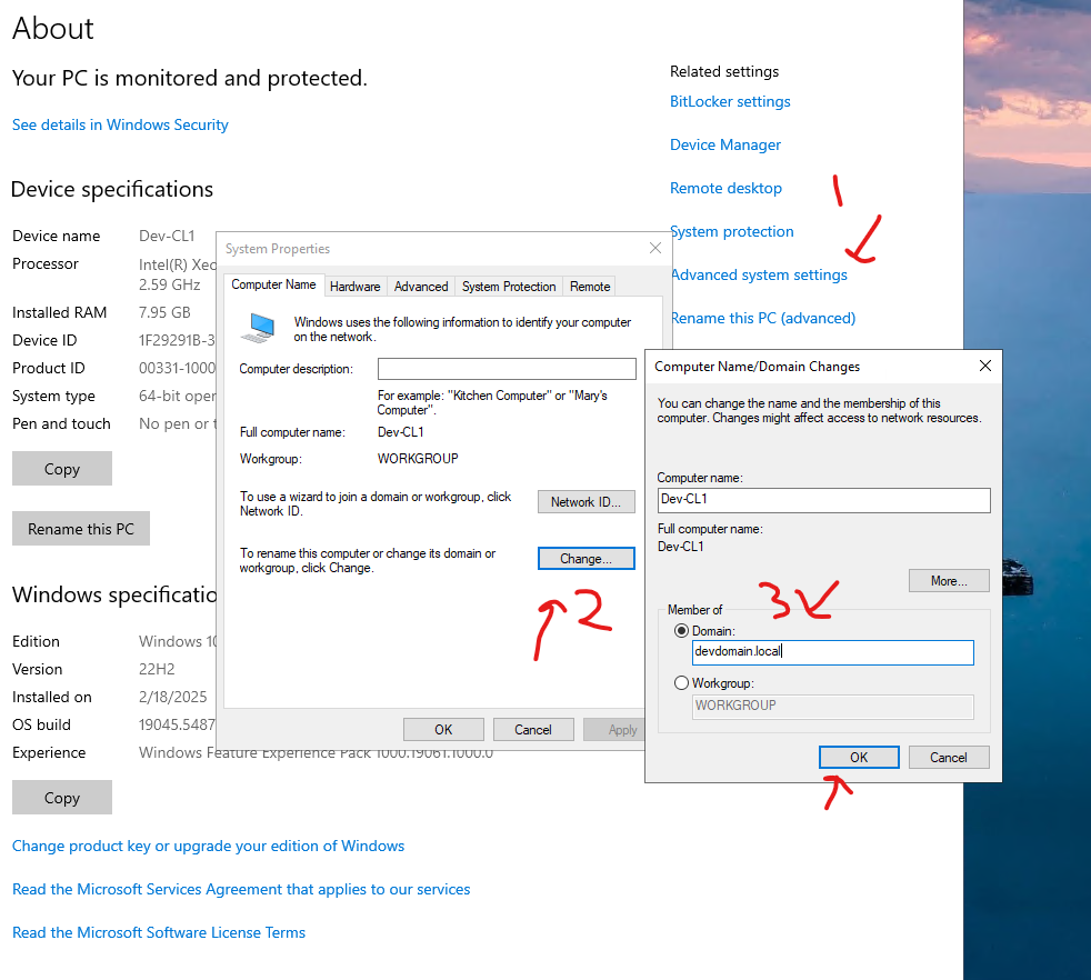 Configure Win10 client internet proctocal, DHCP should be client subnet on the network, DNS and Default gateway should reference active directory ip address.