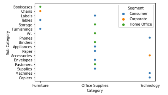 sns.scatterplot(x='Category', y='Sub-Category', hue ="Segment",data=df)