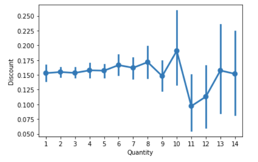 sns.pointplot(x=df["Quantity"],y=df["Discount"])