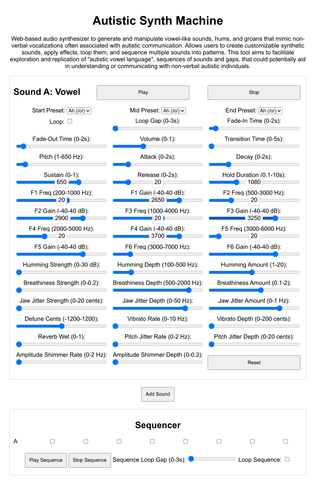 The Autistic Synth Machine (ASM) is a web-based audio synthesizer designed to generate and manipulate vowel-like sounds, hums, and groans that mimic non-verbal vocalizations often associated with autistic communication. Built using HTML, CSS, and JavaScript with the Web Audio API, it allows users to create customizable synthetic sounds, apply effects, loop them, and sequence multiple sounds into patterns. This tool aims to facilitate exploration and replication of "autistic vowel language", sequences of sounds and gaps, that could potentially aid in understanding or communicating with non-verbal autistic individuals.