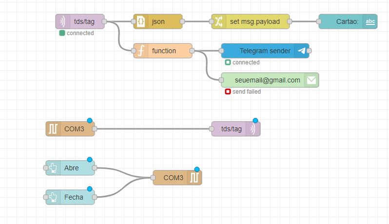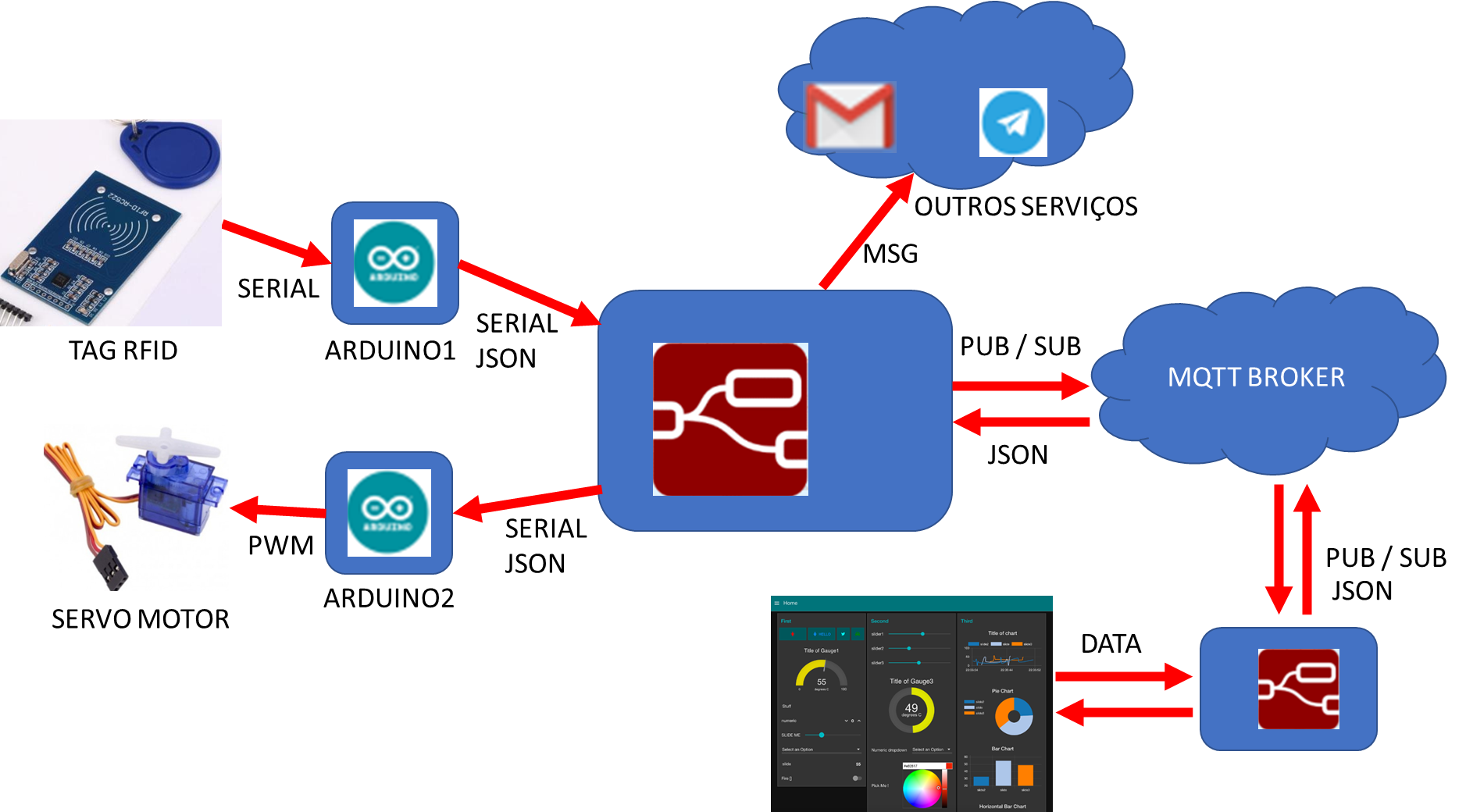 Para atender esta rubrica, o sistema deve ser capaz de coletar a identificação da TAG RFID com o Arduino (ARDUINO1) e envia utilizando formato JSON para um fluxo Node-Red que realiza duas funções: - publica em um tópico utilizando o protocolo MQTT ; - Notifica o usuário via telegram. Um segundo fluxo Node-Red subscreve o tópico e exibe o valor da TAG em um DASHBOARD.