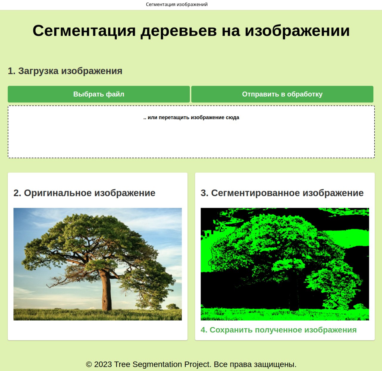 Создает URL-объект из полученного Blob и устанавливает его в качестве src для элемента segmentedImage, а также в качестве href для элемента downloadLink. Это позволяет отображать сегментированное изображение на странице и предоставлять ссылку для его скачивания.