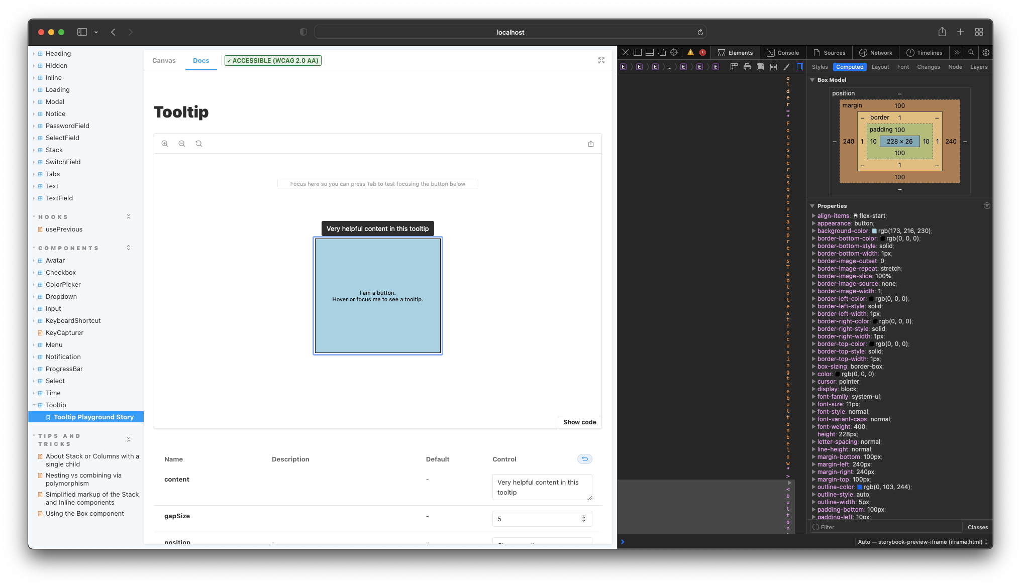 I checked other components in Safari, and all looks good as well. I found one small issue in Tooltip's story -- tab from the input will not focus the button, but hovering works.