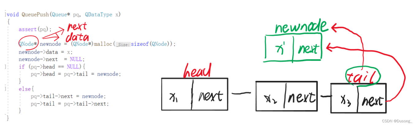 2.若不为空:备份头指针(tail),用while循环找到链表的尾部,最后将尾部的下一个指向新创建的newnode。