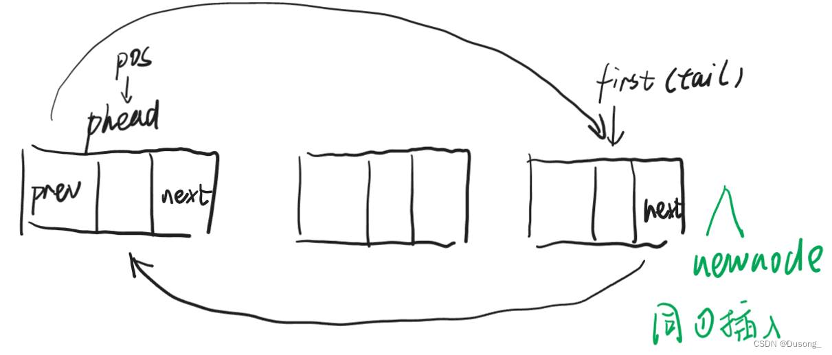 3.同样定义prev,用它借助while循环找到pos的前一位,之后开辟一个newnode,通过next将prev----newnode----pos三者连接起来。